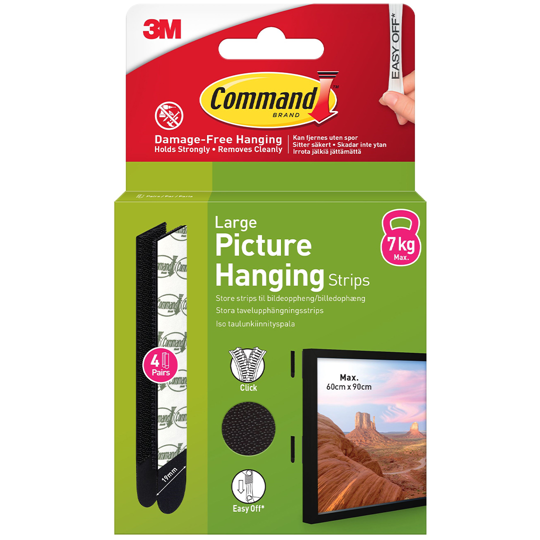 Pakkaus sisältää 4 sarjaa mustia, kapeita nauhoja. Kestää jopa 7 kg painavan kehyksen, kooltaan enintään 60 x 90 cm.
