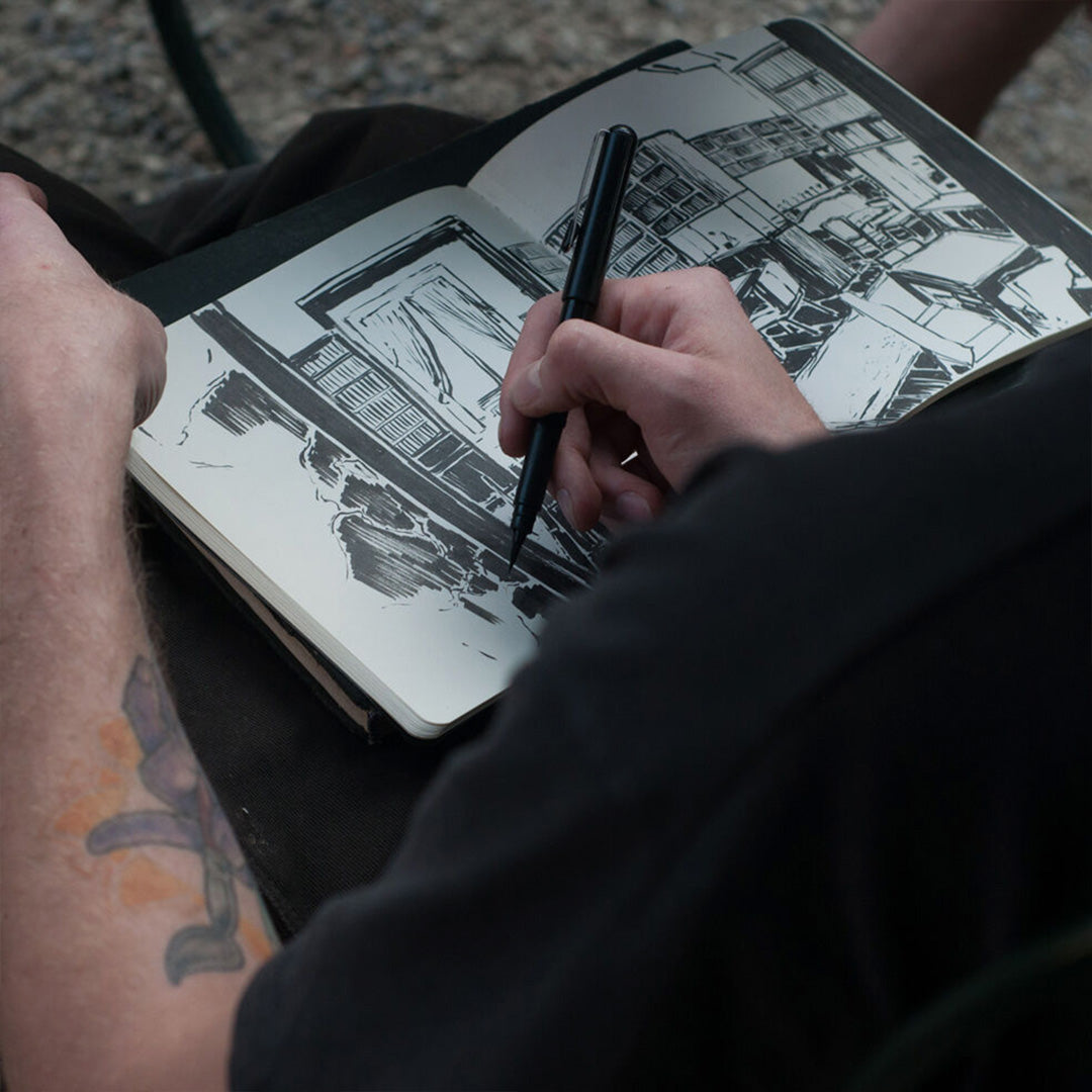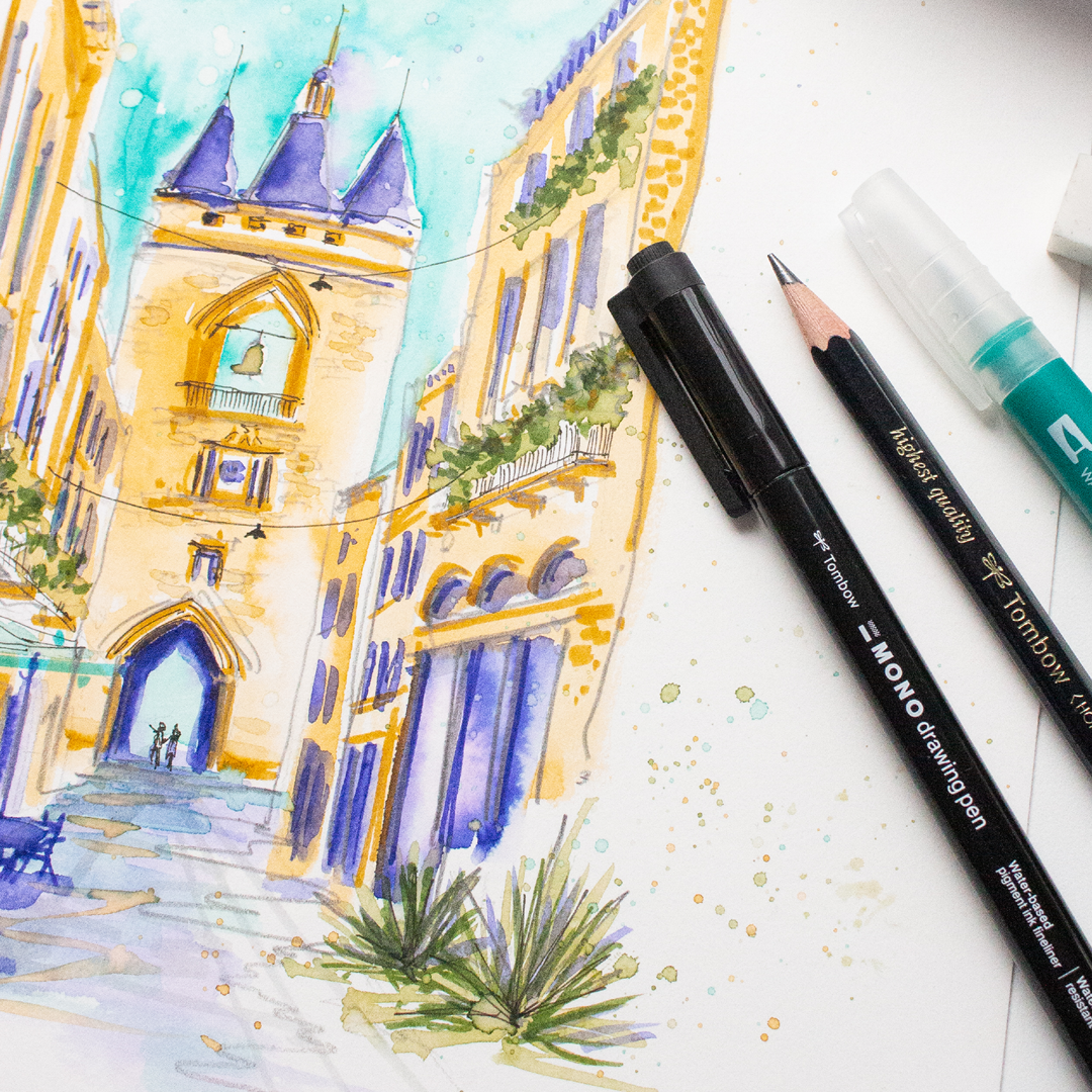 Muista, ettei ole olemassa sääntöjä siitä, mitä materiaaleja urban sketchingissa tulee käyttää. Vaikka muste ja akvarelli ovat yleisiä vaihtoehtoja, monet pakkaavat yhtä mielellään värikyniä, liituja tai muita suosikkeja. Tärkeintä on, että käytät jotain, mistä pidät ja joka tekee aloittamisesta helppoa.