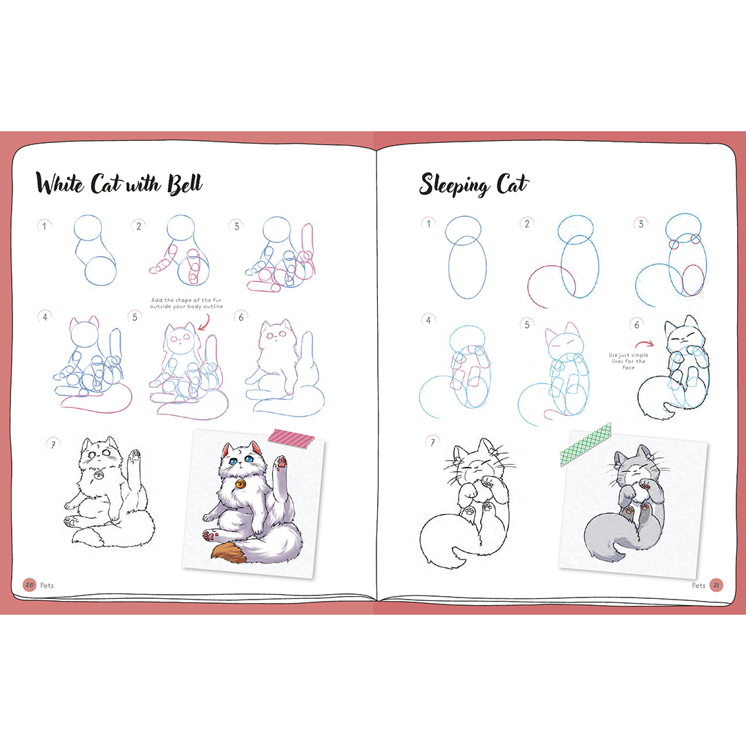 Jokainen vaiheittainen projekti etenee kahdeksassa yksinkertaisessa vaiheessa, alkaen perusmuotojen karkeasta luonnoksesta ja kehittyen vähitellen valmiiksi, väritetyksi piirrokseksi.
