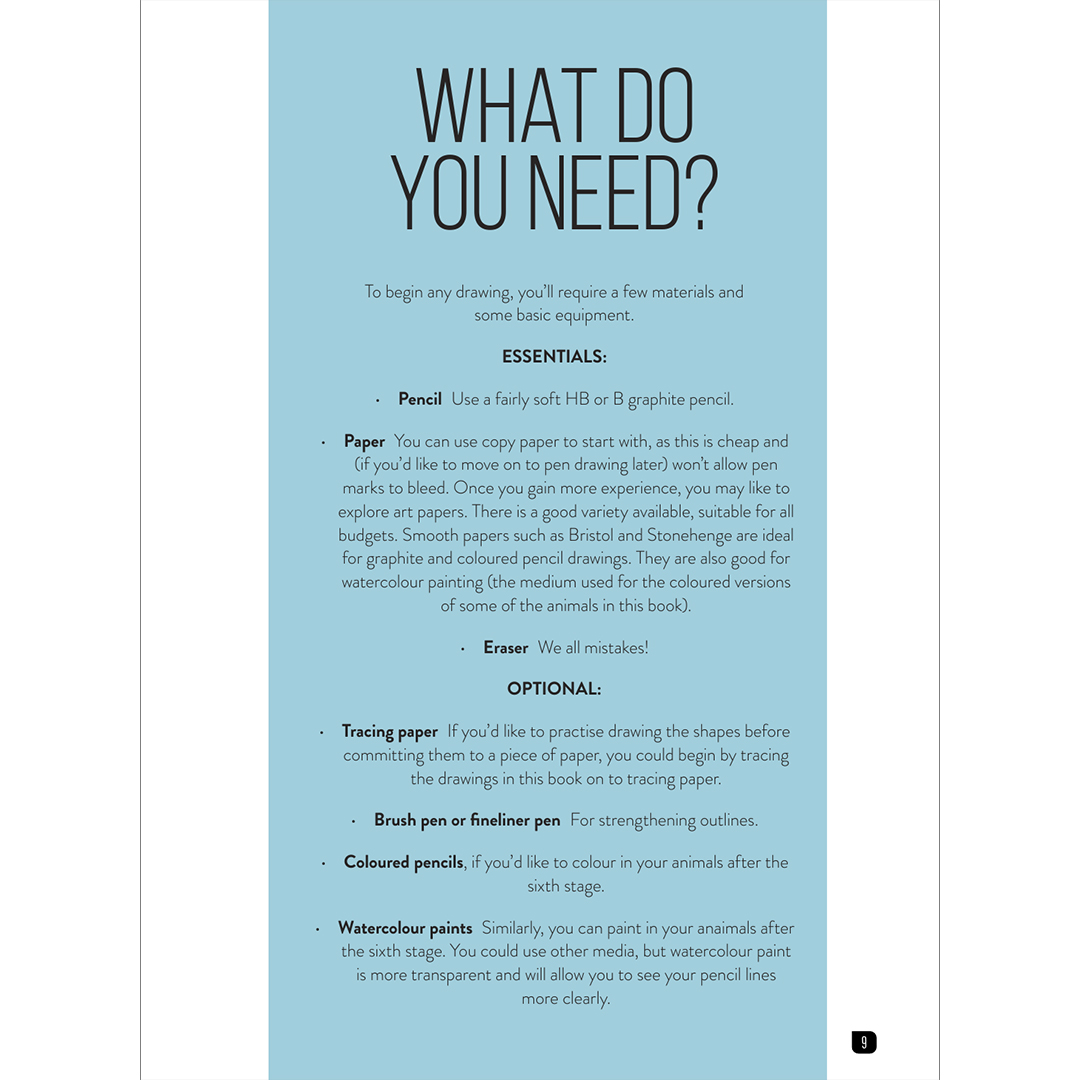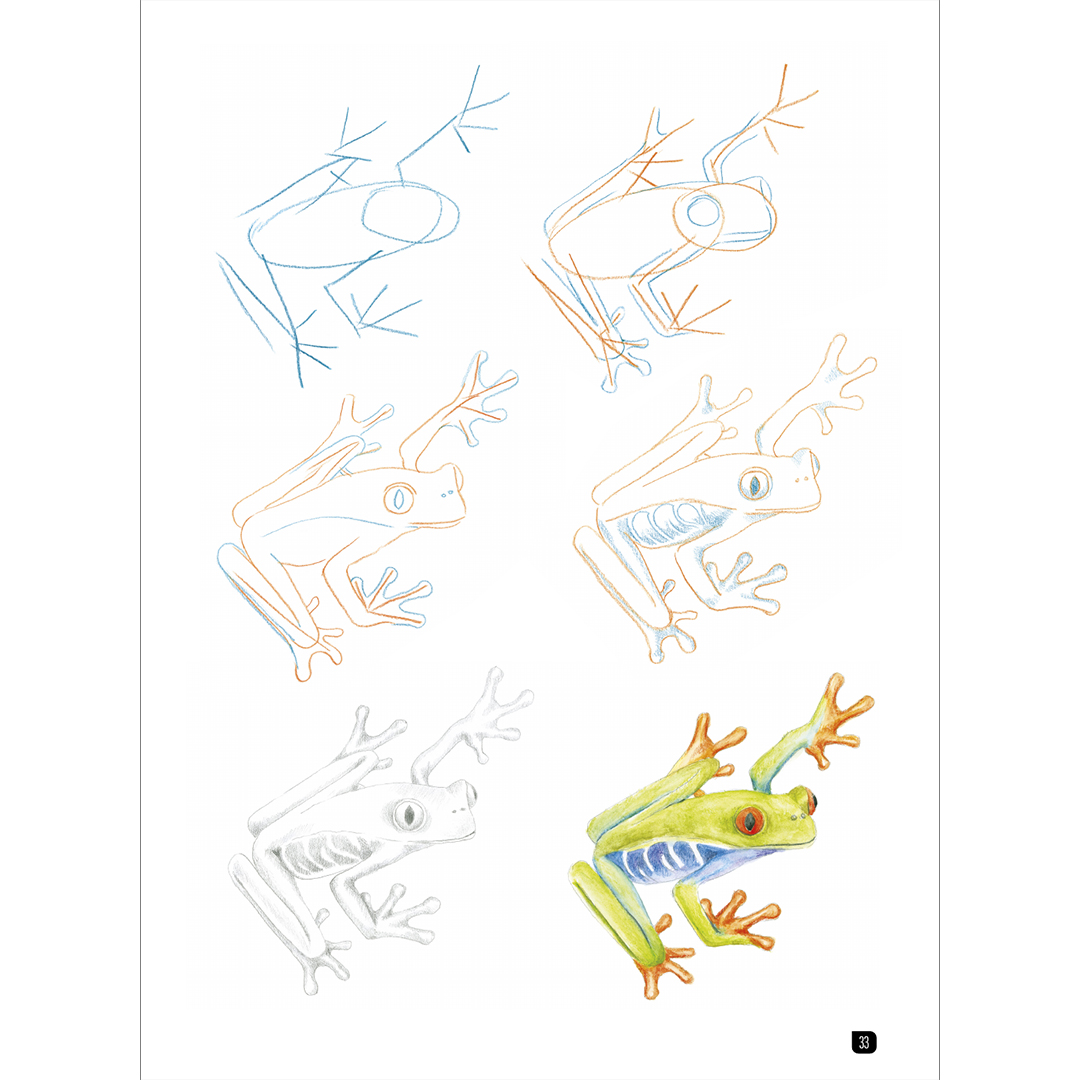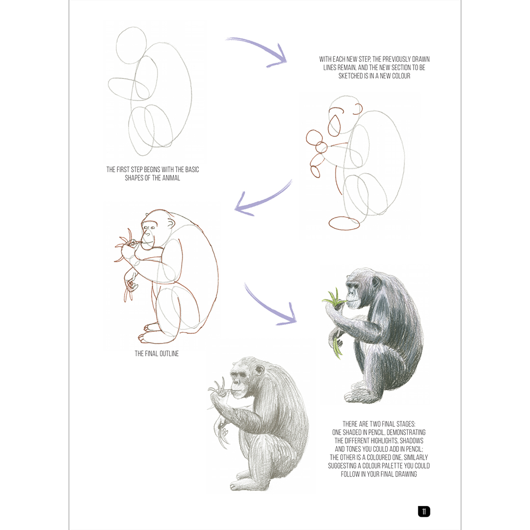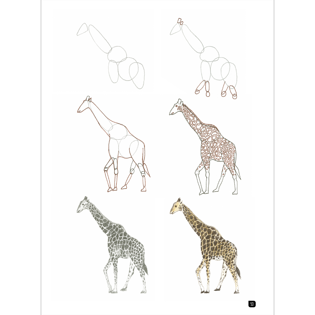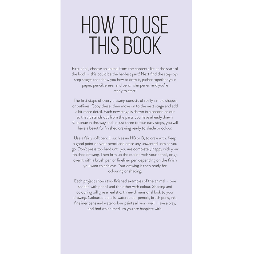 Jokainen eläin on jaettu kolmeen tai neljään yksinkertaiseen vaiheeseen, jotka johdattavat sinut vaivattomasti valmiiseen piirrokseen. Ei ole kirjallisia ohjeita – vain perusmuotoja ja kynänvetoja. Vaikka et olisi koskaan aiemmin piirtänyt, tulet hämmästymään, kuinka nopeasti pystyt luomaan vaikuttavia kuvia. Jokaisessa projektissa on myös kaksi valmista esimerkkiä eläimestä – yksi varjostettuna lyijykynällä ja toinen väreissä.