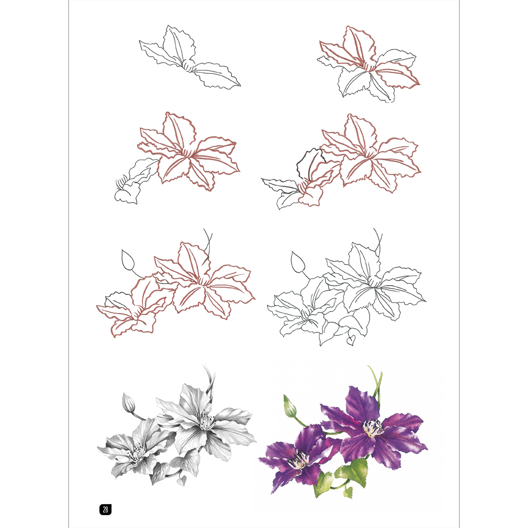 Jokainen kukka on jaettu kuuteen yksinkertaiseen vaiheeseen, jotka johdattavat sinut vaivattomasti valmiiseen piirrokseen. Ei kirjallisia ohjeita – vain perusmuotoja ja kynänvetoja. Vaikka et olisi koskaan aiemmin piirtänyt, tulet hämmästymään, kuinka nopeasti pystyt luomaan vaikuttavia piirroksia. Jokainen projekti näyttää myös kaksi valmista esimerkkiä kukasta – yhden lyijykynällä varjostettuna ja toisen väreissä.
