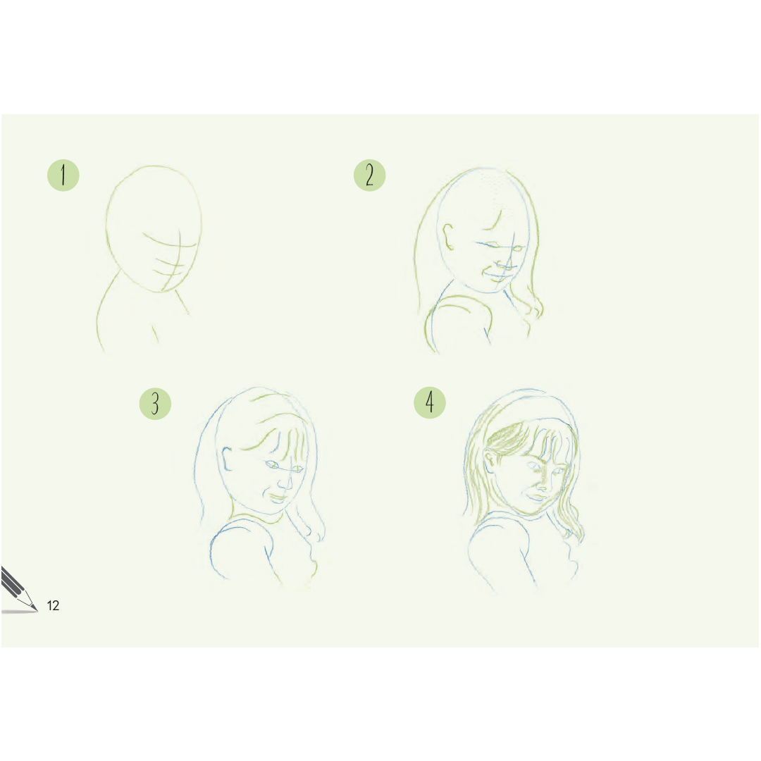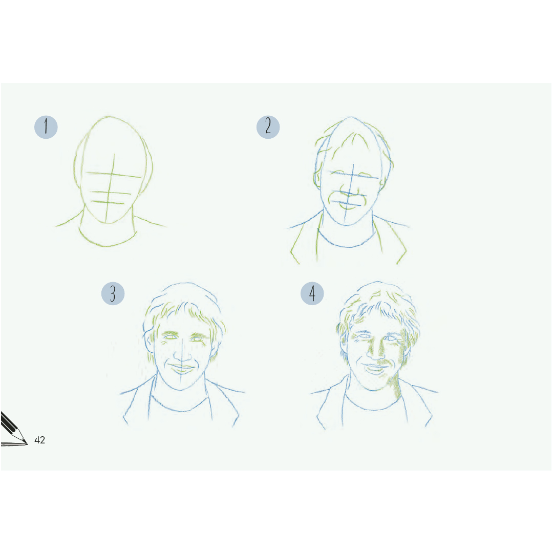 Enintään 6 helpossa vaiheessa opit rakentamaan kuvat vähitellen perusgeometrisistä muodoista valmiisiin kasvoihin asti, selkeällä kaksivärimenetelmällä, joka näyttää tarkasti, miten viivat rakennetaan ja sitten viimeistellään.
