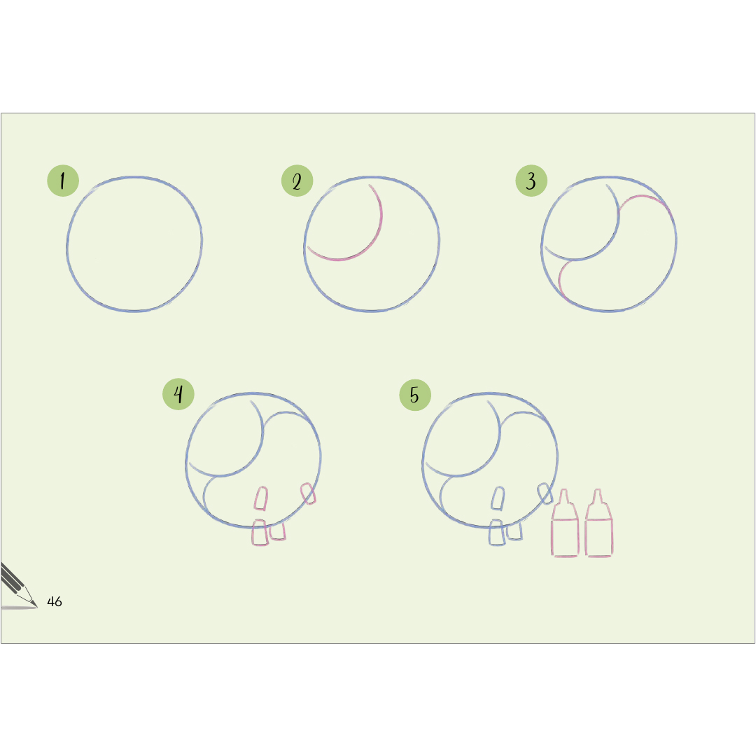 Vaakasuoran, helposti seurattavan taiton ansiosta voit nähdä, kuinka piirros etenee vaihe vaiheelta sivuilla ja toistaa sen itse helposti.