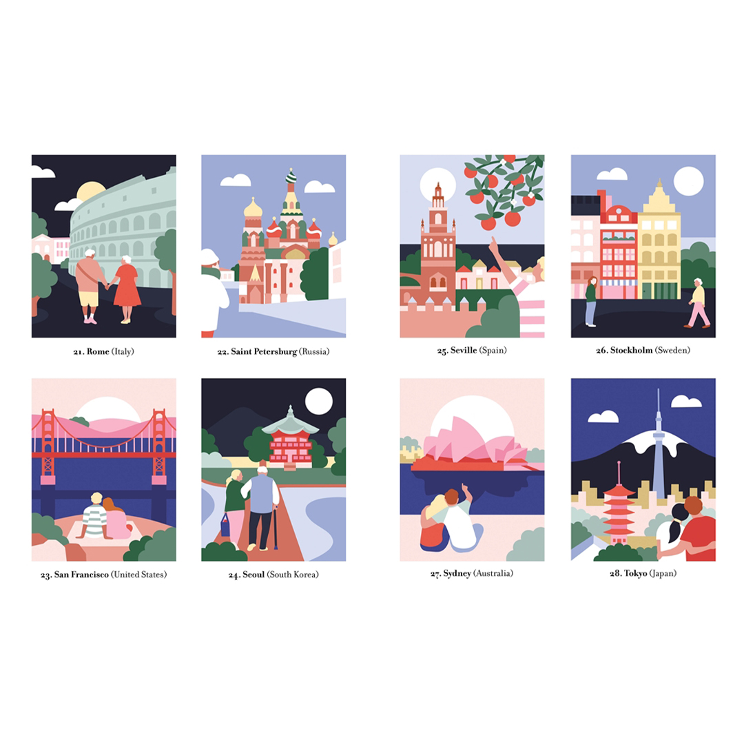 - Jokainen 30 uudesta ja modernista kuvituksesta esittää suositun ja värikkään kaupunkinäkymän, joka paljastuu värittäessä numeroiden mukaan.