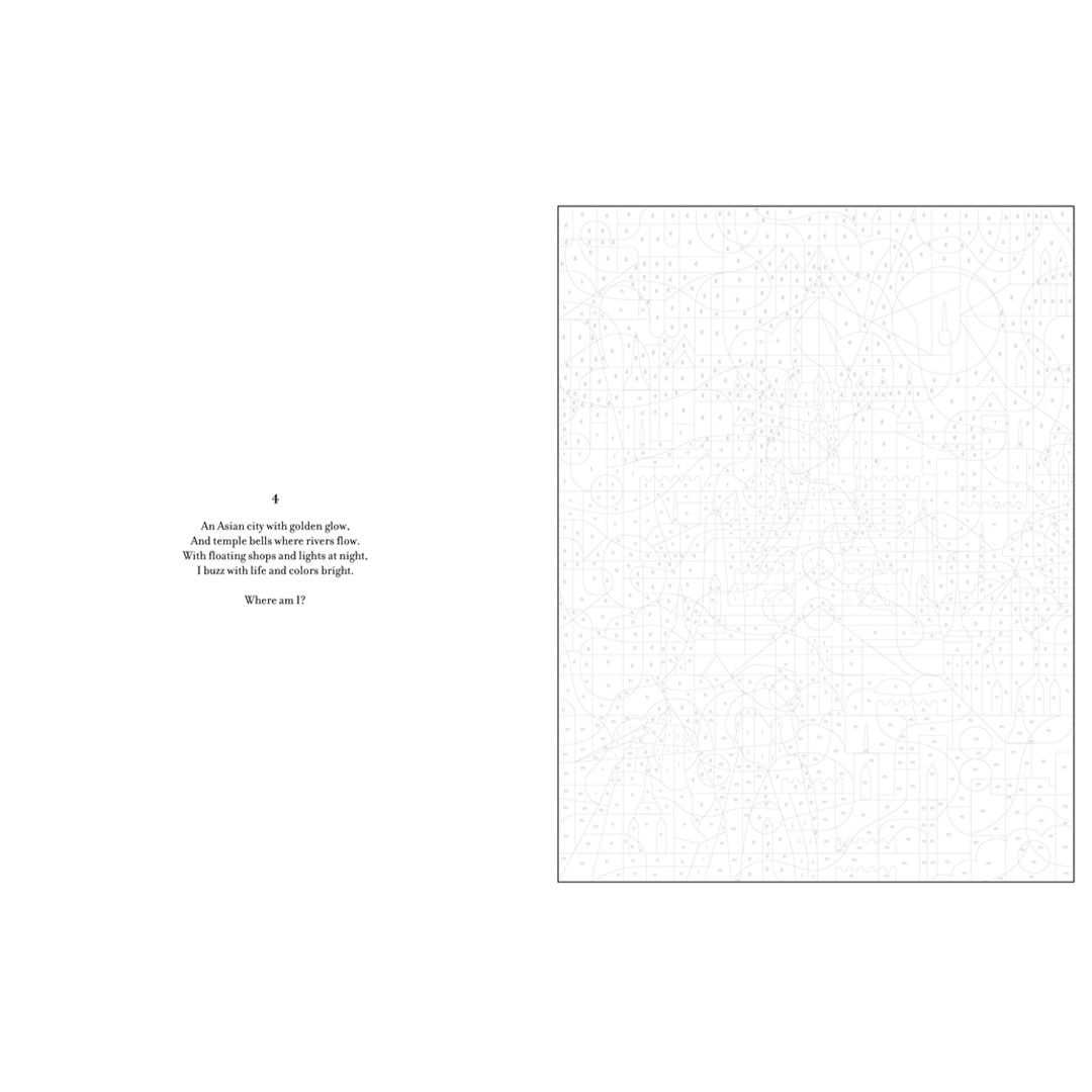 Uusin väritystrendi, joka yhdistää värittämisen ilon ja yllätyksen jännityksen! Jokainen 30 modernista kuvituksesta esittää tunnetun kaupunkimaamerkin eri puolilta maailmaa, joka paljastuu värittäessä numeroiden mukaan, sekä arvoituksen pohdittavaksi samalla kun herätät kuvan eloon. Mukaansatempaava irtiotto kaiken tasoisille värittämisen ystäville.