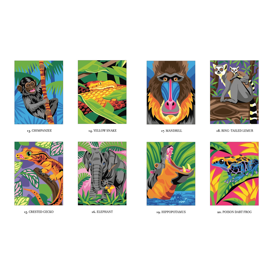 - Jokainen 30 uudesta ja modernista kuvituksesta sisältää suositun ja värikkään villieläimen, joka paljastuu värittäessä numeroiden mukaan.