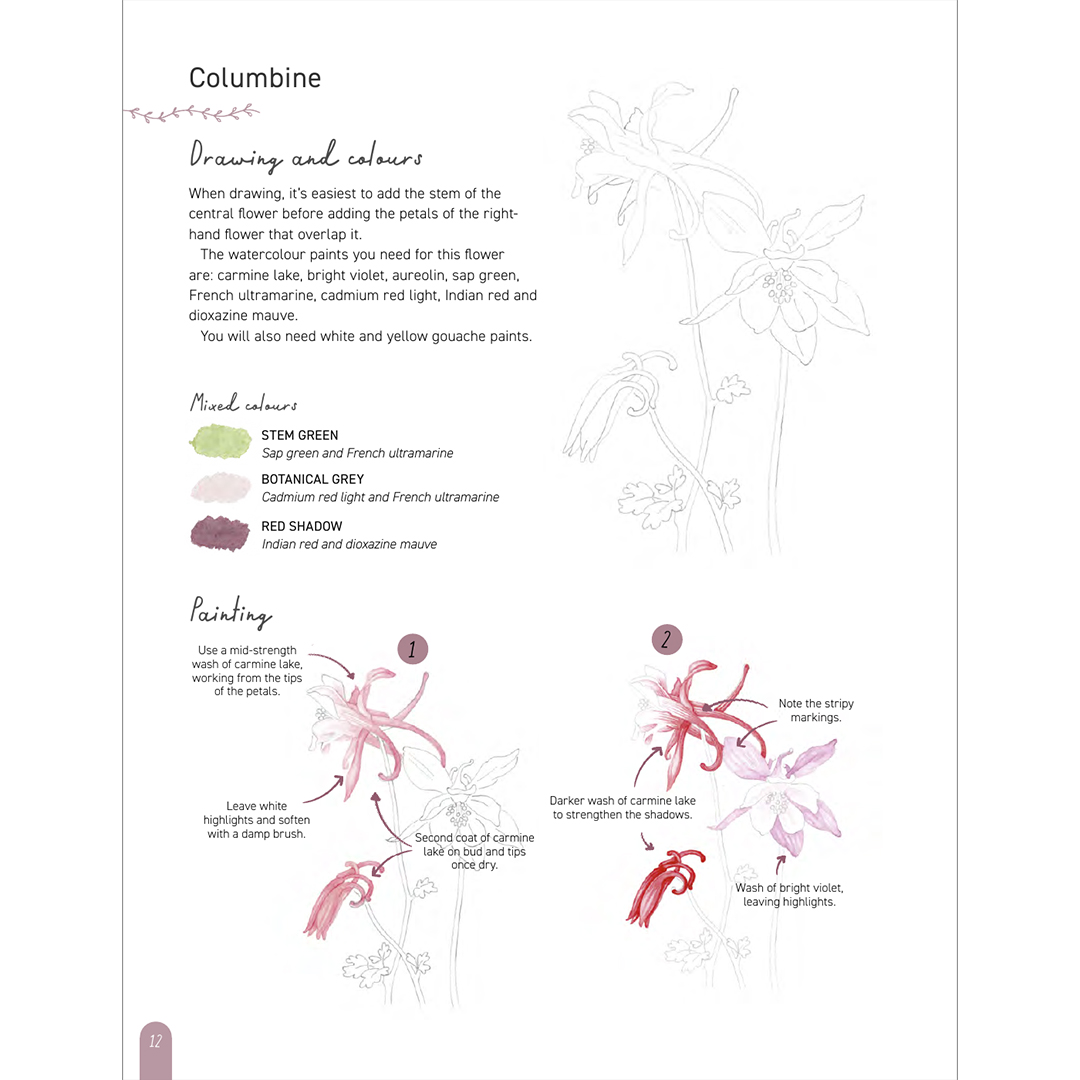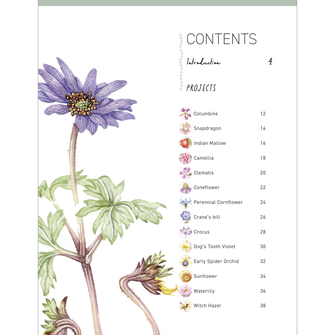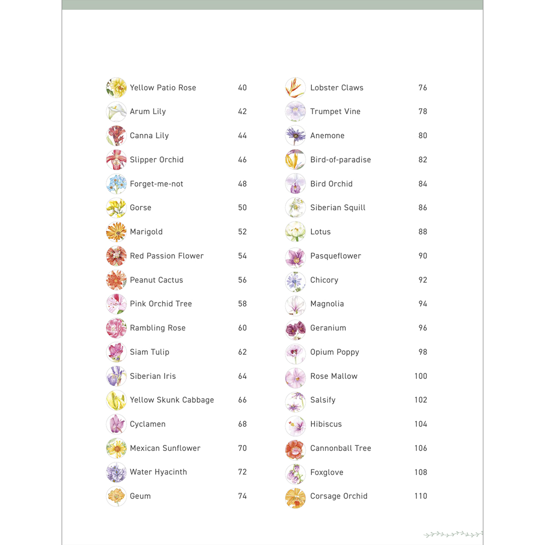 Kirjassa on lyhyt luettelo työkaluista ja materiaaleista, joilla pääsee alkuun, sekä selkeä ja informatiivinen opas perusmenetelmiin, joita tarvitaan tämän monipuolisen kukkakokoelman maalaamiseen.