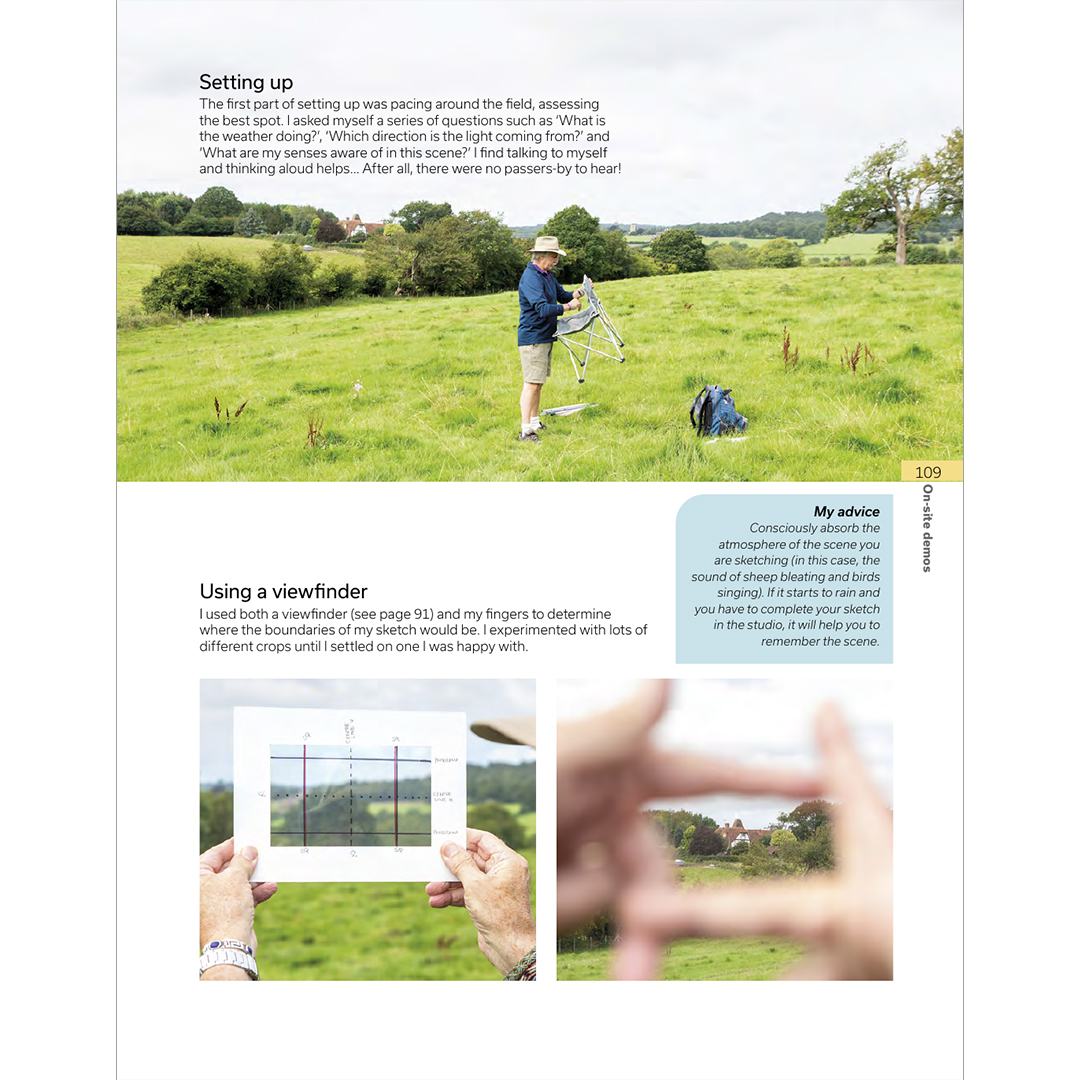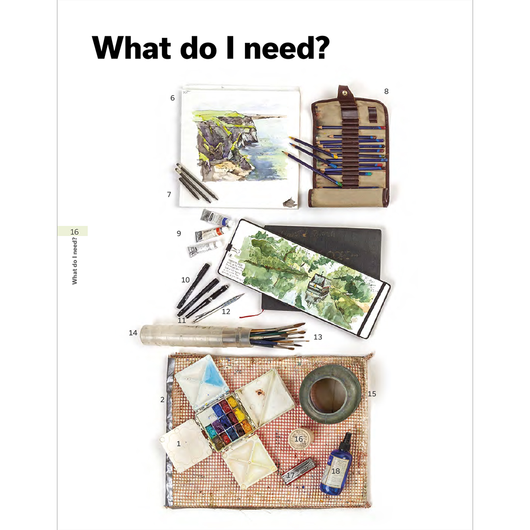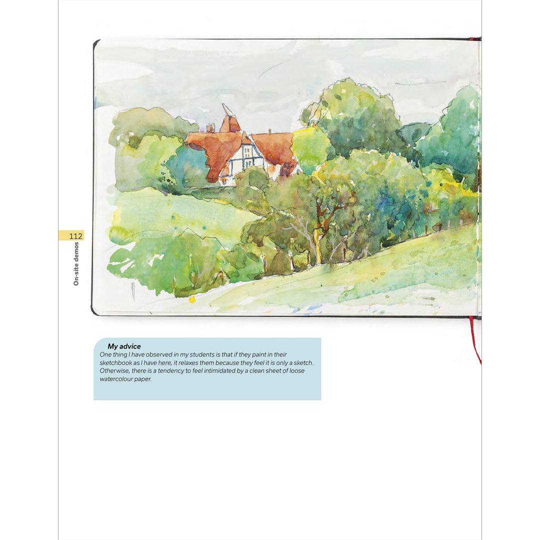 Tämä on kätevä kirja, jota haluat palata selaamaan yhä uudelleen. Se on täynnä inspiroivaa taidetta ja sisältää viisi esittelyä: rannikkokohtaus musteella; maaseutupanoraama akvarellissa; tyypillinen englantilainen kylä guassilla; kaupunkimaisema linjapiirroksena ja akvarellipesuna; sekä puita akvarellikynillä.