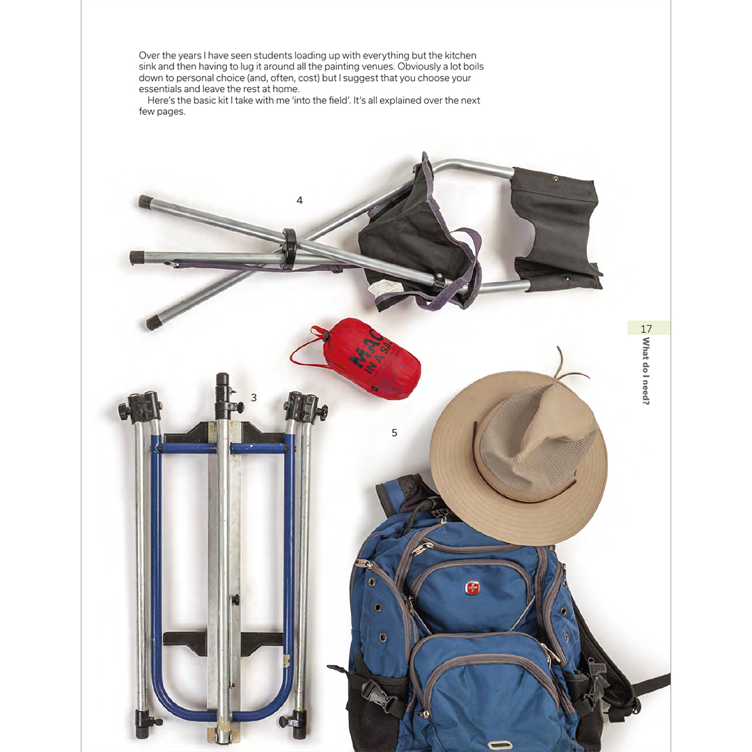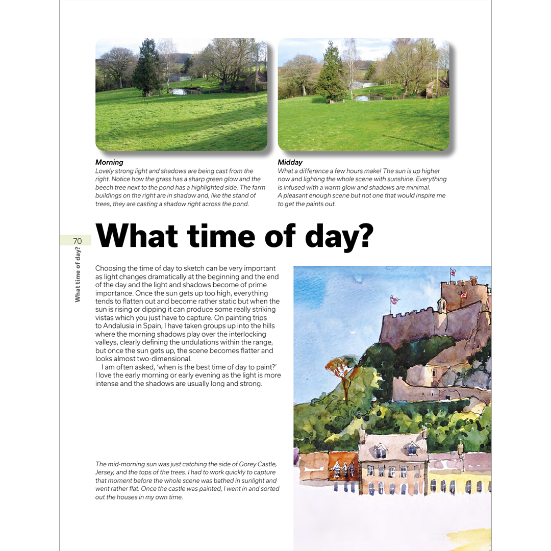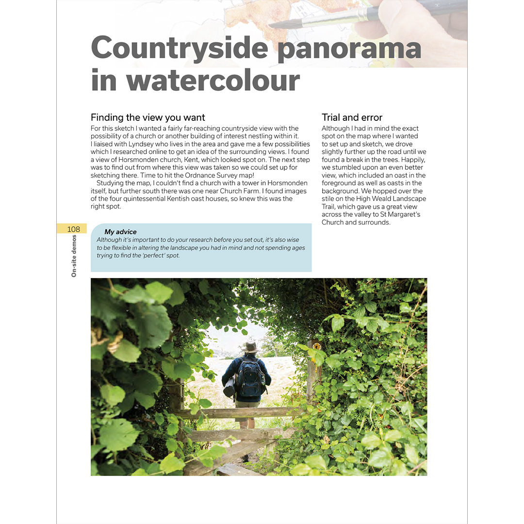 Tämä on kätevä kirja, jota haluat palata selaamaan yhä uudelleen. Se on täynnä inspiroivaa taidetta ja sisältää viisi esittelyä: rannikkokohtaus musteella; maaseutupanoraama akvarellissa; tyypillinen englantilainen kylä guassilla; kaupunkimaisema linjapiirroksena ja akvarellipesuna; sekä puita akvarellikynillä.