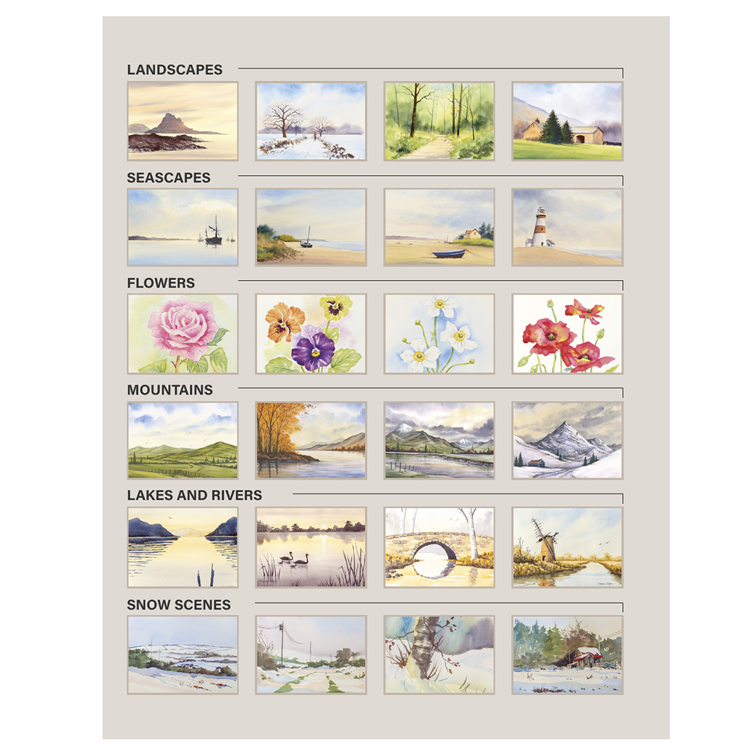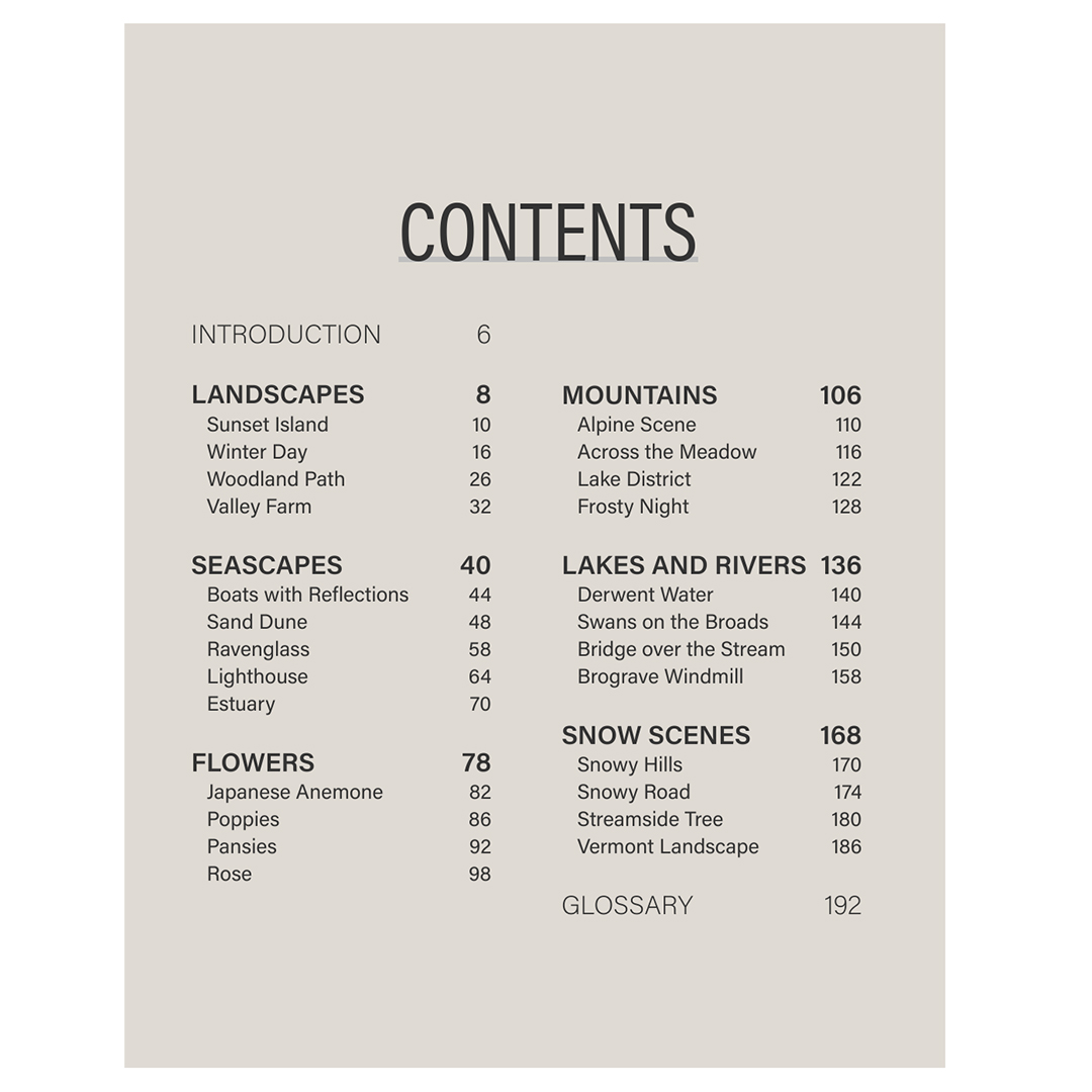 Projektien teemat sisältävät maisemia, meriaiheita, kukkia, vuoria, järviä ja jokia sekä talvisia lumimaisemia. Kirjan lopussa on myös kattava sanasto, joka selittää kirjan yleisimmin käytetyt termit ja tekniikat.