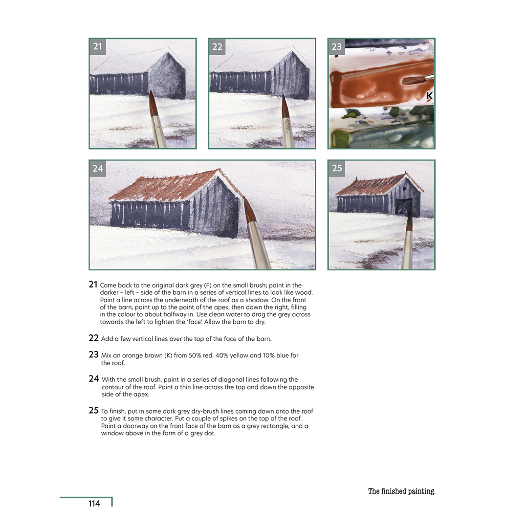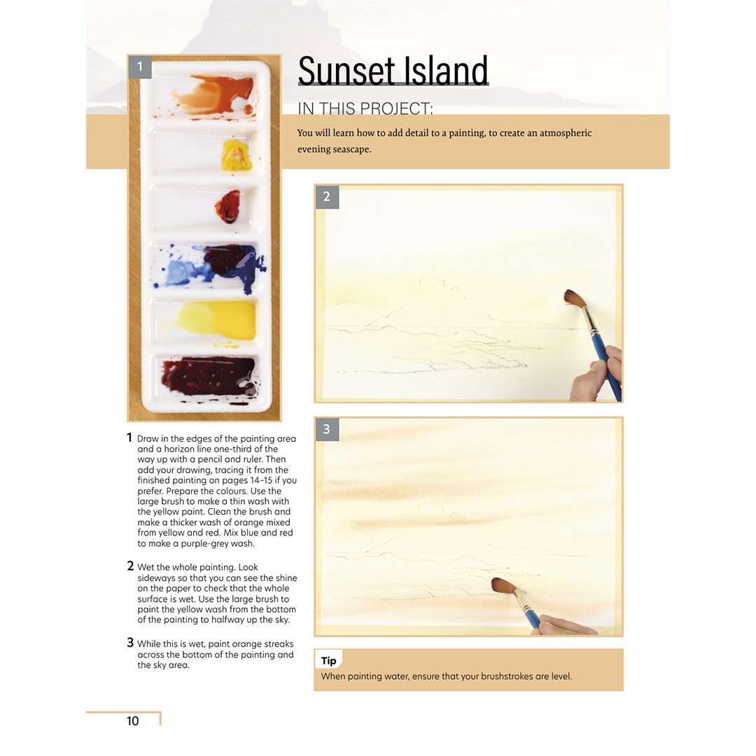 Kirjassa on yhteensä 25 projektia. Jokainen projekti tutustuttaa sinut erilaisiin akvarellitekniikoihin ja opastaa sinua vaihe vaiheelta selkeillä ohjeilla. Käytät vain kolmea puhdasta väriä ja niiden monia sekoituksia sekä kolmea sivellintä koko maalauksen viimeistelyyn.