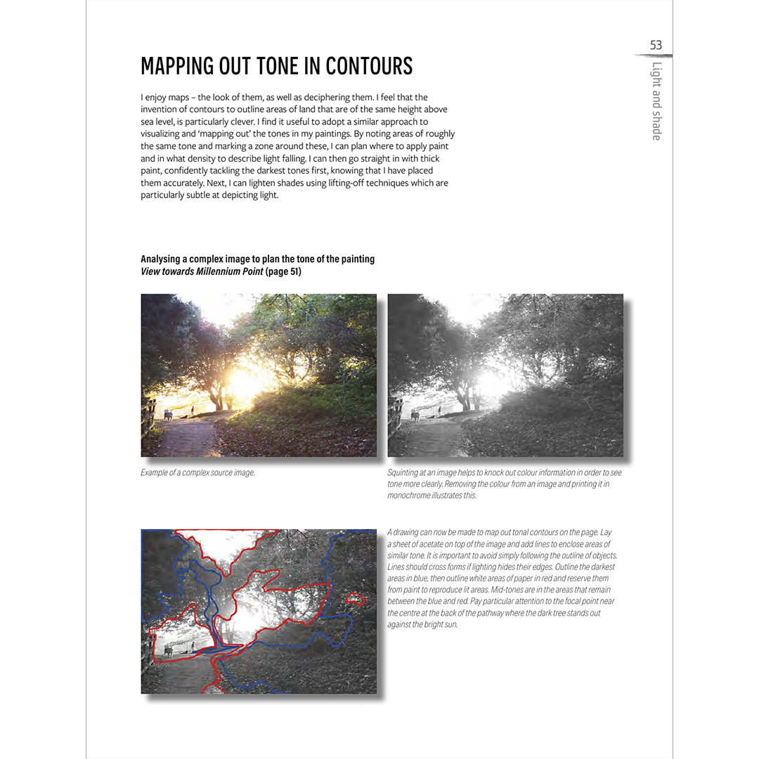 Kirja alkaa tekniikan, käytettyjen materiaalien ja värien sekä maiseman olemuksen vangitsemisen tärkeyden esittelyllä. Se sisältää lukuisia harjoituksia, joiden vaikeusaste kasvaa vähitellen, demonstraatioita ja inspiroivia valmiita maalauksia, jotka näyttävät heijastusten, sumun ja varjojen kiehtovat vaikutukset sekä erilaisten taivaiden dramaattiset erot.