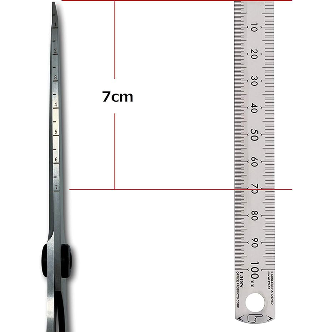 70 mm viivain terässä: Nämä sakset toimivat myös mittana. Leikkaa ilman viivainta terän 70 mm merkintään asti ja paranna työkapasiteettia.