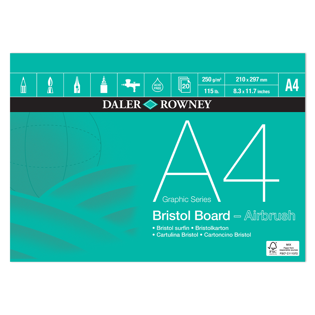 Daler-Rowney Bristol Board on erittäin tukeva, pinnoitettu paperi, joka soveltuu airbrush-siveltimelle. Toimii hyvin myös tussikynän, musteen, siveltimen ja lyijykynän/värikynän kanssa. 20 liimattua arkkia jokisessa lehtiössä. Paino/m2: 250 g.