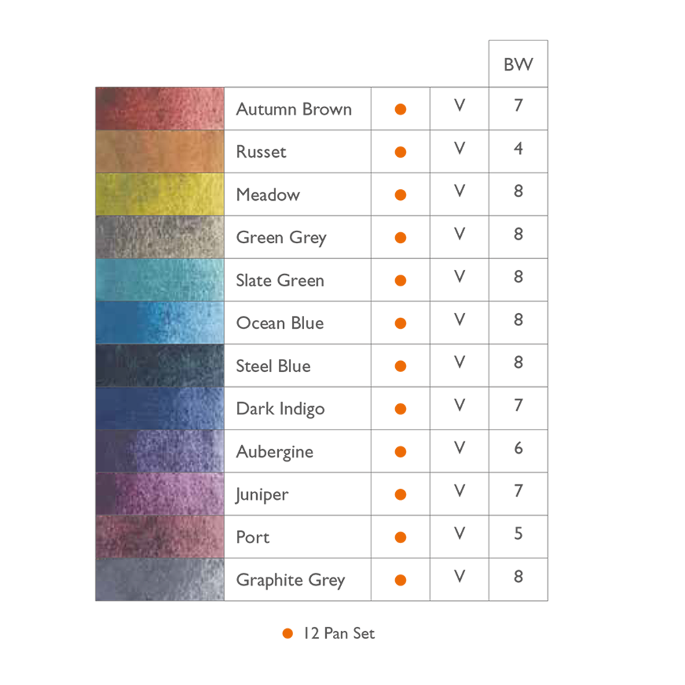Värit: Port, Juniper, Aubergine, Dark Indigo, Steel Blue, Ocean Blue, Slate Green, Green Grey, Meadow, Russet, Autumn Brown, Graphite Grey