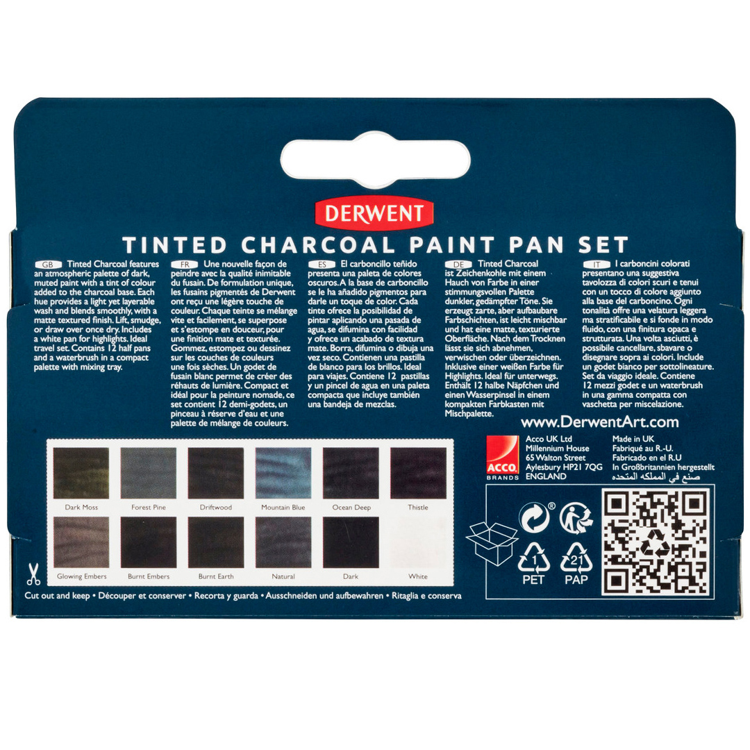 Tässä setissä on erityinen, vedellä liukeneva hiilivärikaava. Settiin kuuluu 12 tummaa ja hillittyä sävyä sekä valkoinen korostuksiin. Voit luoda sekä runsaita värisävyjä että läpikuultavia vivahteita. Värit ovat mattapintaisia, hieman sävytettyjä ja säilyttävät hiilen tunnusomaisen luonteen, tuoden paperille syvyyttä ja tilantuntua. Värit on helppo levittää kosteina ja ne sekoittuvat sulavasti keskenään.