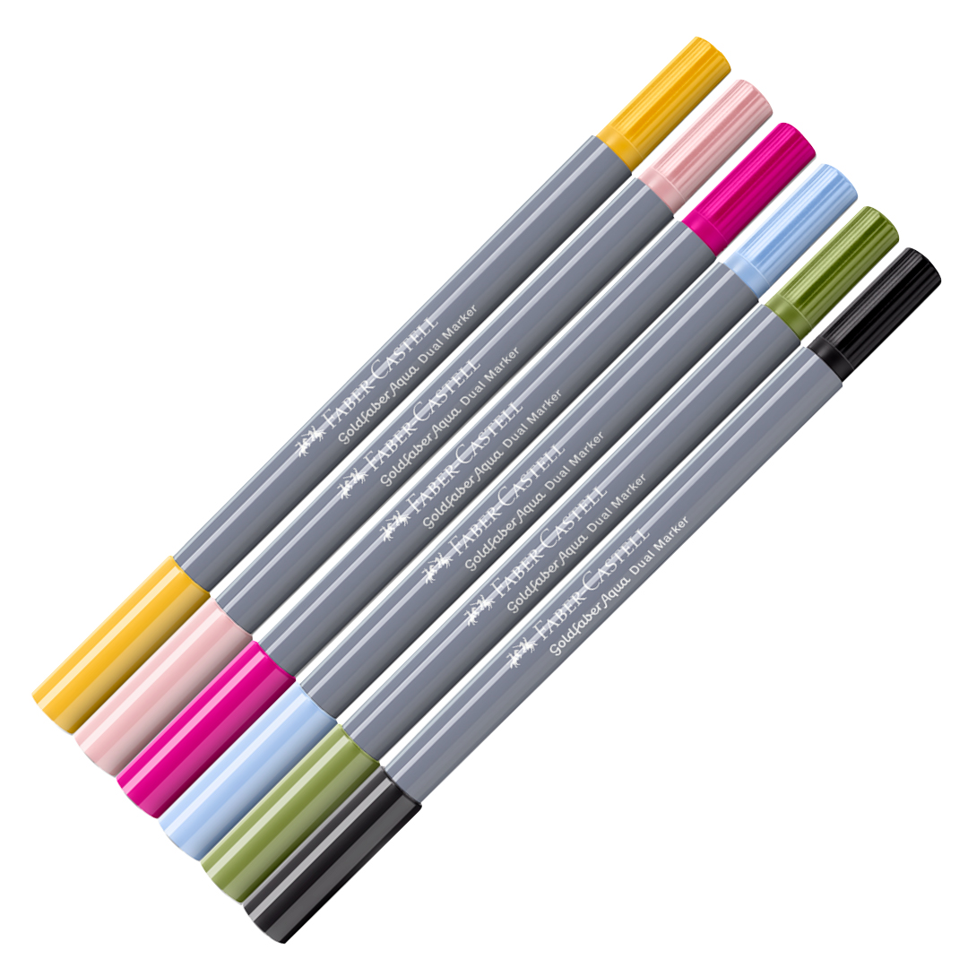 Aqua Dual Marker yhdistää kapean, yksityiskohtia täynnä olevan kärjen joustavan sivellinkärjen kanssa. Erinomainen yhdistelmä luonnosten tekemiseen, ääriviivojen piirtämiseen, lettering-tekniikkaan ja väritykseen. Muste on sekä vesipohjaista, eli se ei vuoda paperin läpi että vesiliukoista, eli sitä voidaan käyttää akvarellitehosteiden luomiseen paperilla.