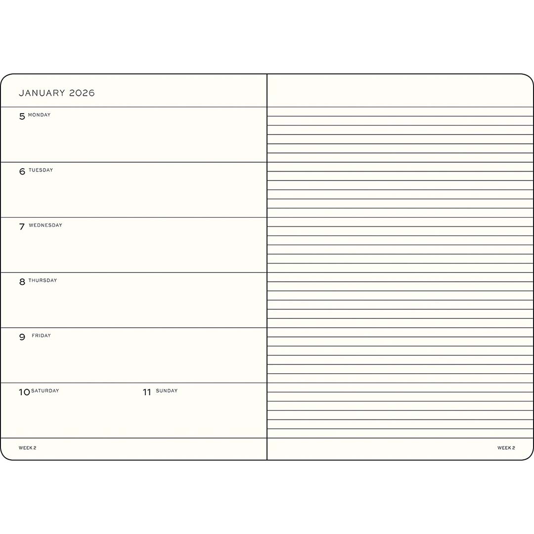 Suunnittele vuotesi Leuchtturm1917-kalenterin avulla A5-koossa kovilla kansilla. “Weekly Planner and Notebook” tarjoaa viikkonäkymän vasemmalle sivulle ja tilaa muistiinpanolle oikealle. Asettelu tarjoaa runsaasti tilaa suunnitteluun, organisointiin ja muistiinpanoihin.
