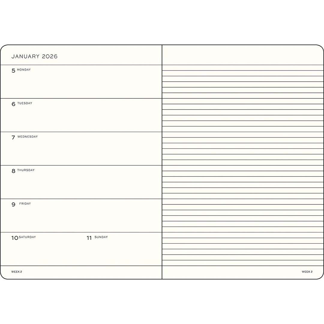 Suunnittele vuotesi Leuchtturm1917-kalenterilla A5-koossa, pehmeillä kansilla. ”Weekly Planner and Notebook” tarjoaa viikkonäkymän vasemmalla sivulla ja tilaa muistiinpanoille oikealla. Asettelu tarjoaa runsaasti tilaa suunnittelulle, organisoinnille ja muistiinpanoille.