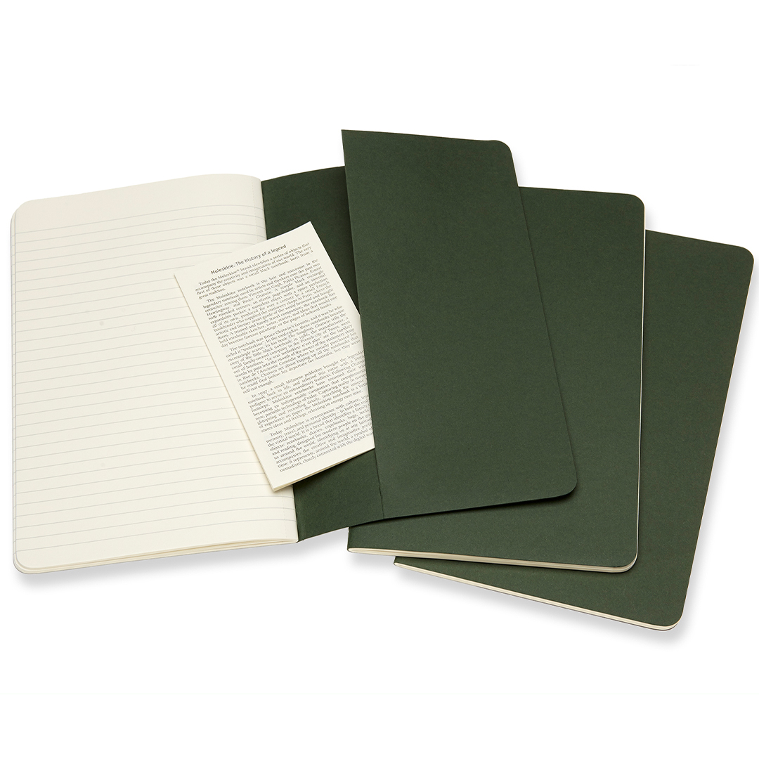 Kolmen muistikirjan setti koossa Large-koko (13 x 21 cm) italialaiselta Moleskinelta. Jokaisessa kirjassa on 64 sivua, joista viimeiset 16 ovat irrotettavia. Ommeltu sidonta ja sisätasku. Korkealaatuista, happovapaata paperia!