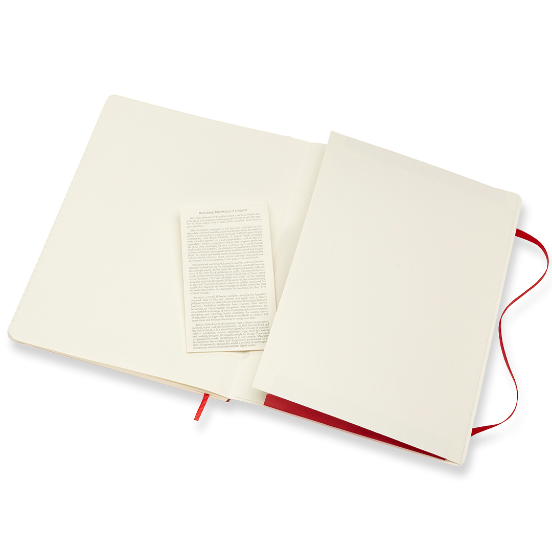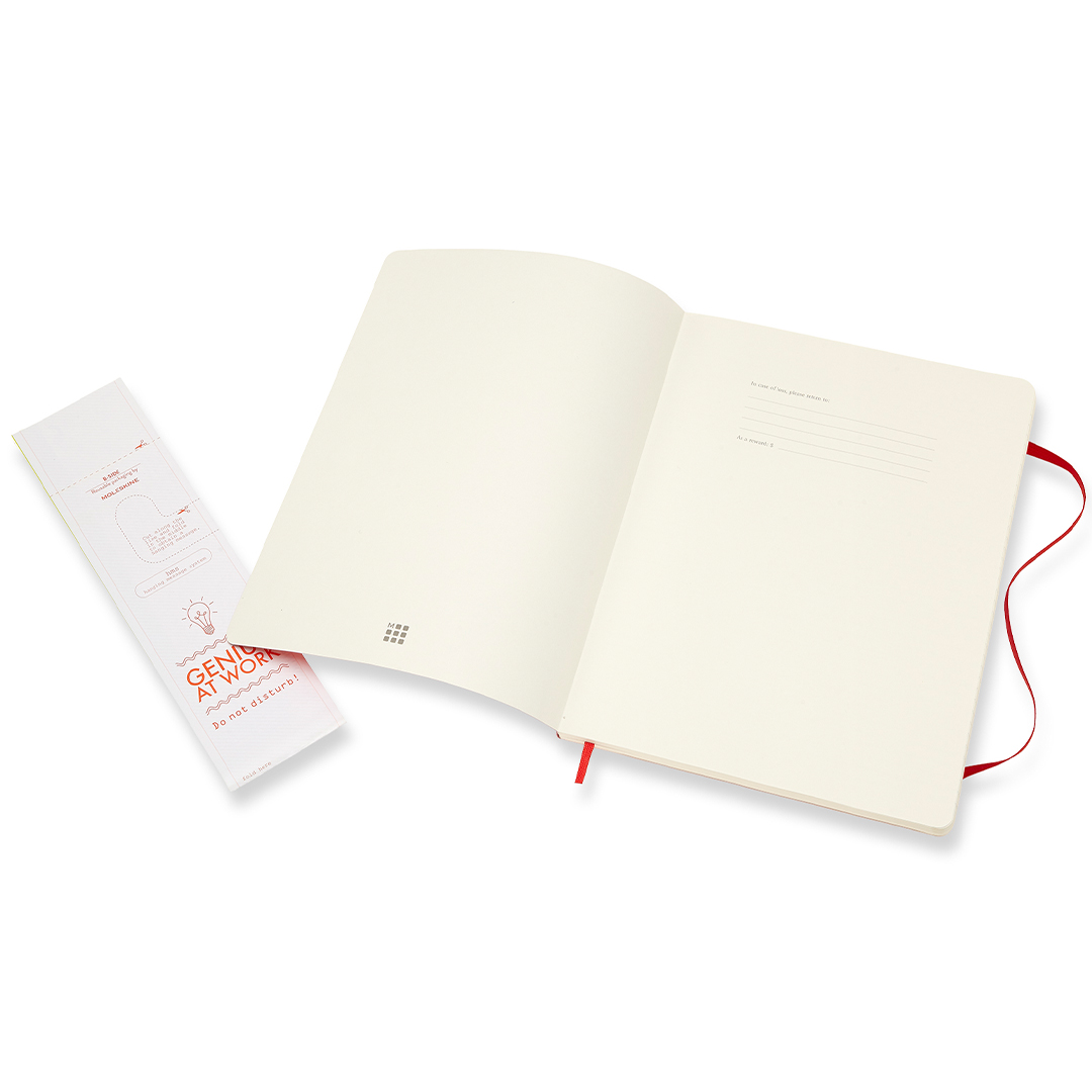 Muistikirja pehmeällä joustavalla kannella XL-koossa (19 x 25 cm) italialaiselta Moleskineltä. Muistikirjassa on 192 sivua, laajennettava sisätasku sekä kuminauha, joka pitää kirjan kiinni kun sitä ei käytetä. Norsunluuvärinen paperi on FSC-sertifioitu, happovapaa ja laadukasta!
