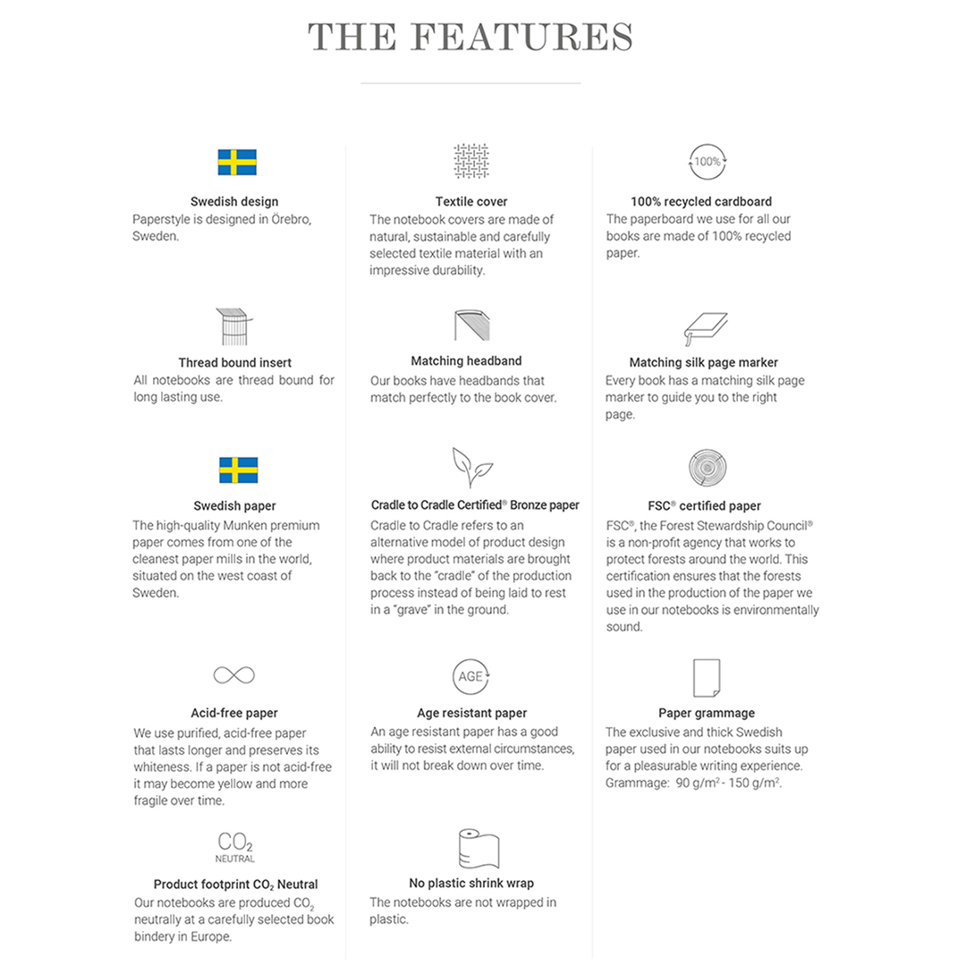 Paperstylen A5-kokoinen muistikirja. Ruotsalaisesta ympäristösertifioidusta, hapottomasta 100 gramman laatupaperista valmistettu päiväkirja, joka takaa korkean kirjoitusmukavuuden.
