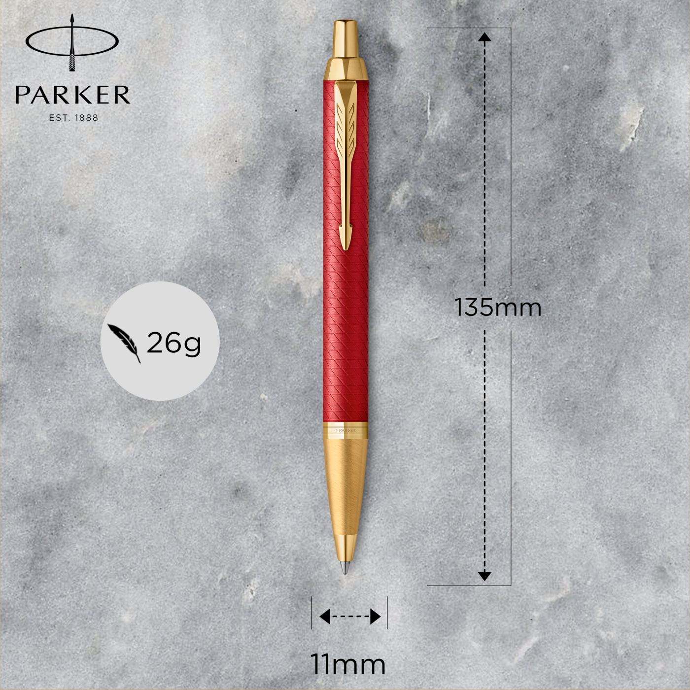 Yli 130 vuoden ajan Parker on valmistanut kyniä ja hionut tekniikoitaan tarjotakseen korkealaatuisia kirjoitusvälineitä. IM Premium ei ole poikkeus. IM Premium on ammattimainen ja tyylikäs kynä, jossa yhdistyvät kapeneva muoto ja ikoniset yksityiskohdat. Kynä on valmistettu messingistä ja siinä on kuulakärki, joka mahdollistaa sileät linjat ja pehmeän kirjoituskokemuksen. IM Premium erottuu selvästi joukosta kynän runkoon kaiverretun kuvion ansiosta – loppusilaus, jonka ansiosta kynä sopii niin lahjaksi kuin sinulle itsellesi. Punainen mattalakka kaiverretulla timantin muotoisella kuviolla ja kullanvärisillä yksityiskohdilla varustettuna. Täydennettynä Parkerin omilla patruunoilla kuulakärkikynille. Toimitetaan yksittäisessä lahjapakkauksessa, joka sisältää patruunan. Tämä malli on saatavana myös pallokärki- ja mustetäytekynänä.