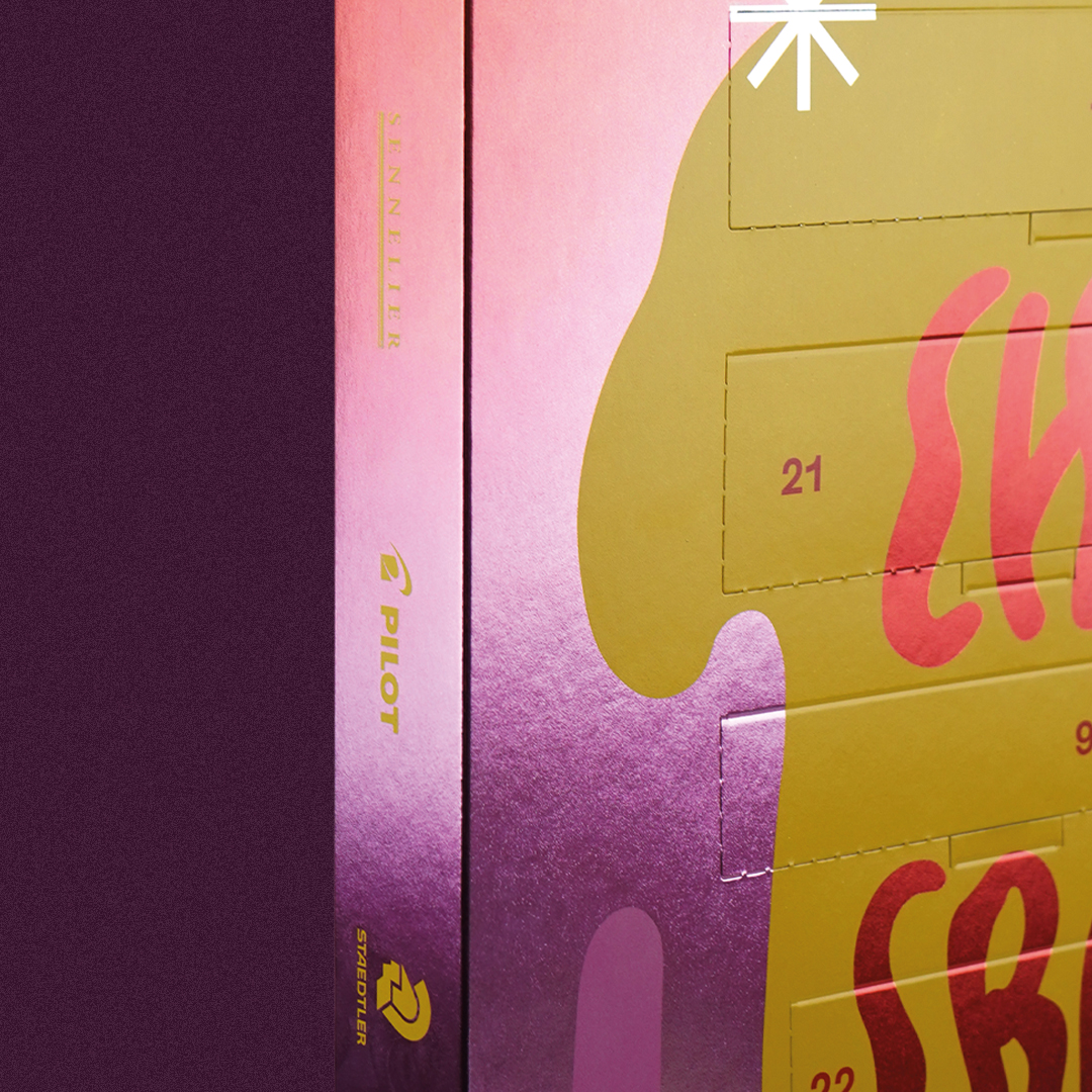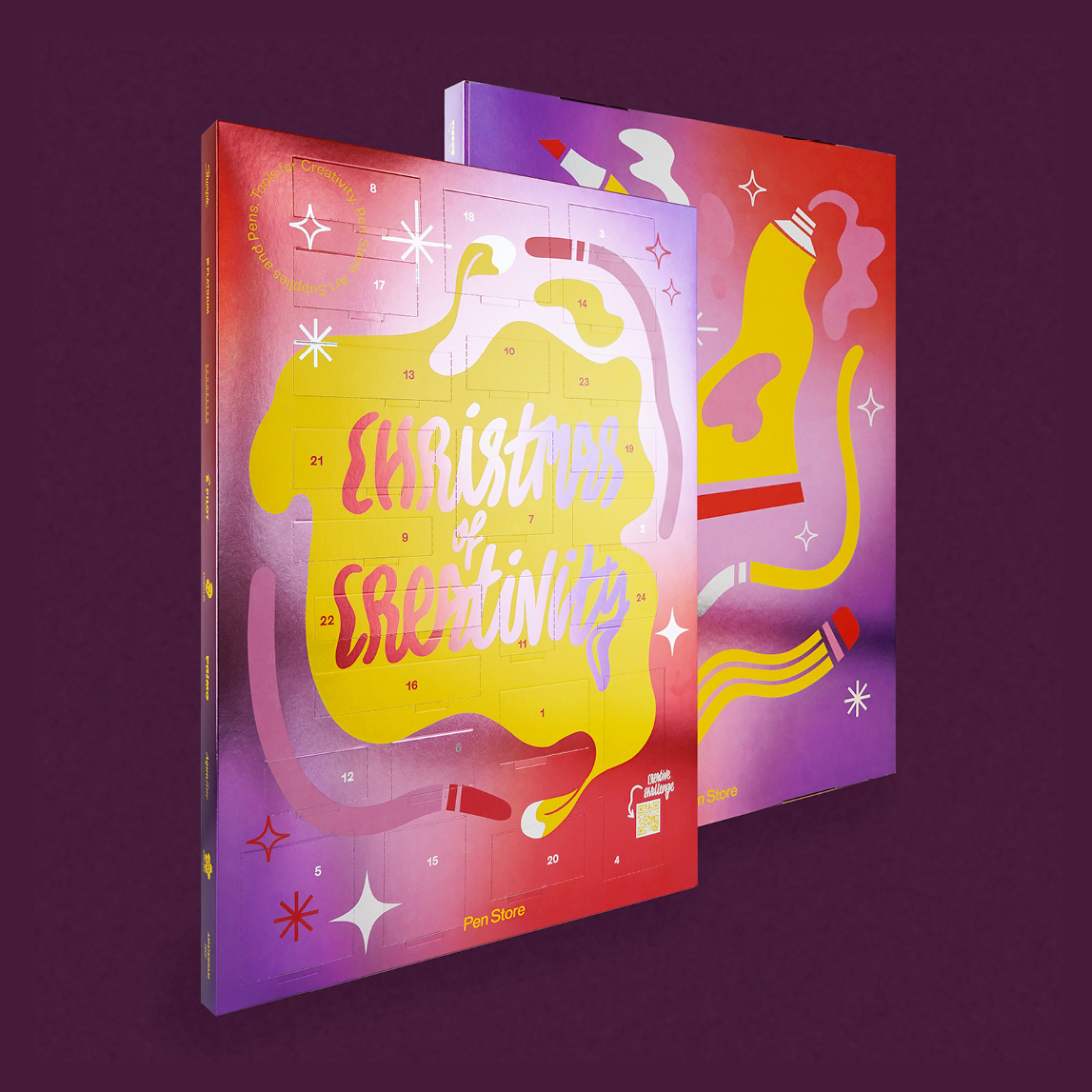 Tämän vuoden kalenteri loistaa kuin joulupallo ja sisältää tuotteita joiltakin alan arvostetuimmilta valmistajilta: Sakura, Aquafine, Sennelier, Platinum, Staedtler, Sharpie, Primo, Pilot, Amsterdam, Leuchtturm1917, Lyra, Stabilo, Giotto, ZIG Kuretake, Ecoline, Rhodia, Raphael ja Blockx.