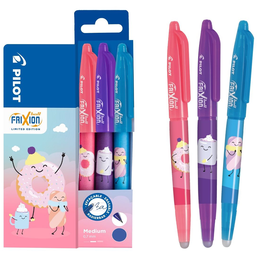 Winter Sweet Collection FriXion Ball koostuu kolmen ainutlaatuisen kynän setistä, joissa on leikkisiä hahmoja: Dizzy Donut (energinen ja leikkisä), Choco Hug (rauhallinen ja huolehtiva) ja Fluffy Mallow (pehmeä ja suloinen). Tämä rajoitettu erä sopii täydellisesti tekemään kirjoittamisesta lämmintä ja luovaa myös kylminä talvipäivinä.