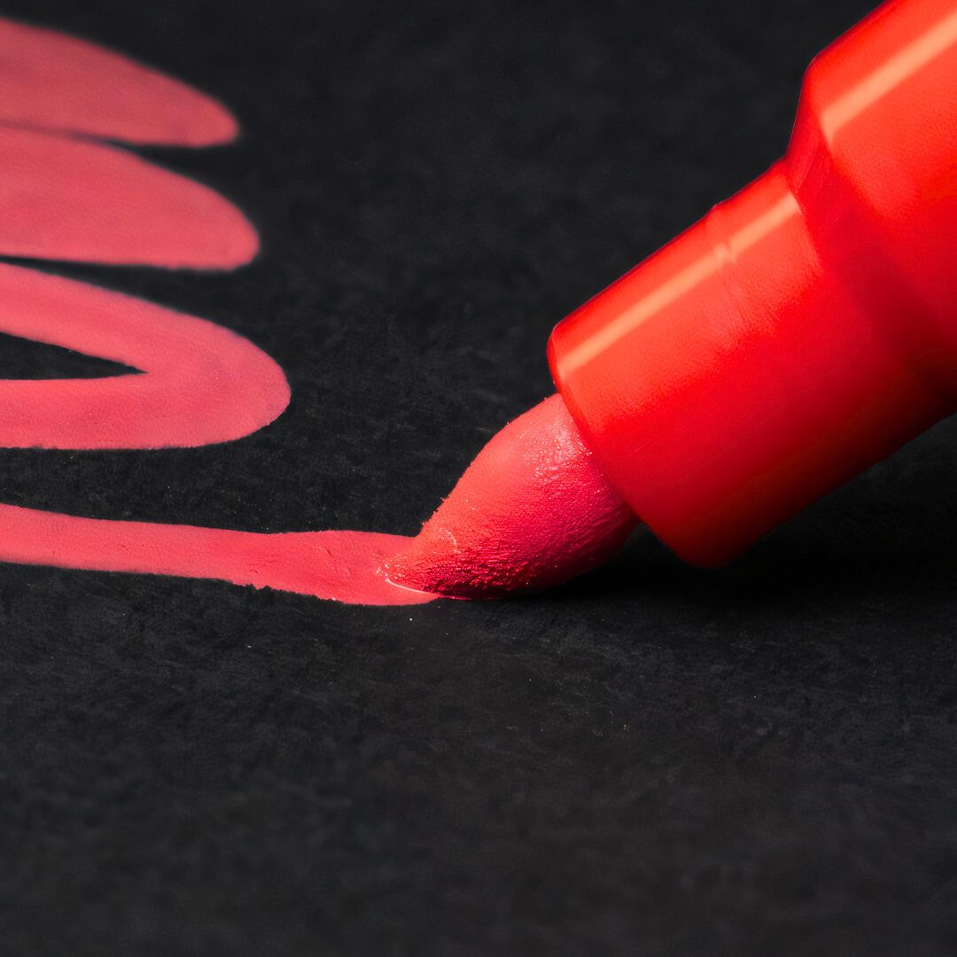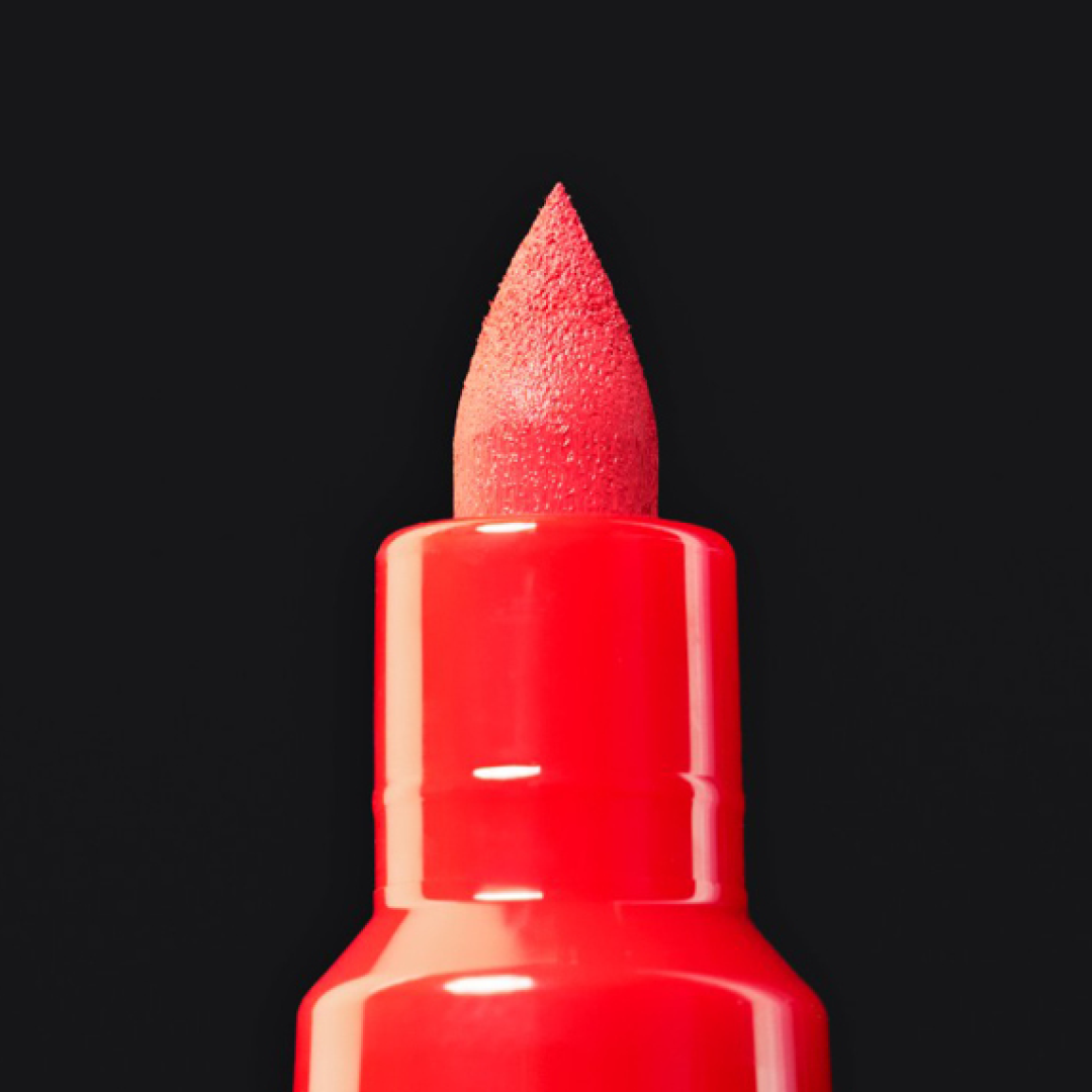 Posca Brush erottuu ainutlaatuisen kärjen ansiosta. Toisin kuin perinteisessä sivellinkynässä, siinä ei ole harjaksia, vaan sama kiinteä ja tukeva kärki kuin tavallisessa Posca-maalitussissa. Muoto on kuitenkin kuin siveltimessä: leveä tyvestä ja kapea kärjestä. Kärki on puolijoustava, mikä tarkoittaa, että se on tarpeeksi jämäkkä tasaisen värivirran takaamiseksi, mutta silti tarpeeksi joustava taipumaan sopivasti sulaviin, maalaaviin vetoihin. Paineen mukaan voit tehdä viivoja noin 1–4 mm leveinä. Kärki on lisäksi tarpeeksi kestävä kestääkseen karheita pintoja ja sen voi kääntää, kun haluat pidentää kynän käyttöikää.