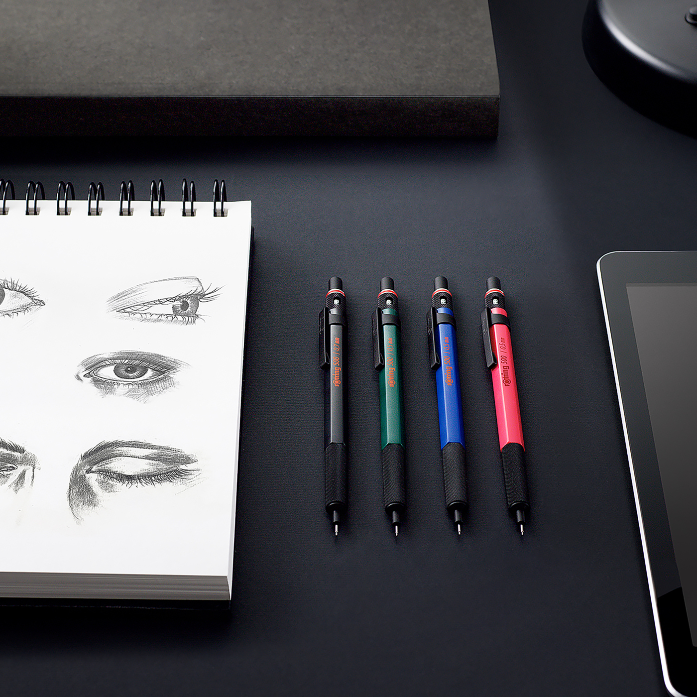 Rotring 500 -lyijytäytekynä. Kuusikulmainen muovirunko irrotettavalla metallisella klipsillä. Päässä pyyhekumi. Sylinterin muotoinen, metallinen otepinta urituksella. Pyöritä yläosaa nähdäksesi lyijyn kovuuden.