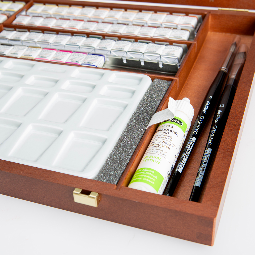 Puulaatikossa on myös posliinipaletti, peitekynä ja kaksi da Vinci -sivellintä.