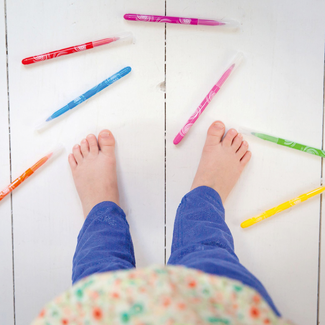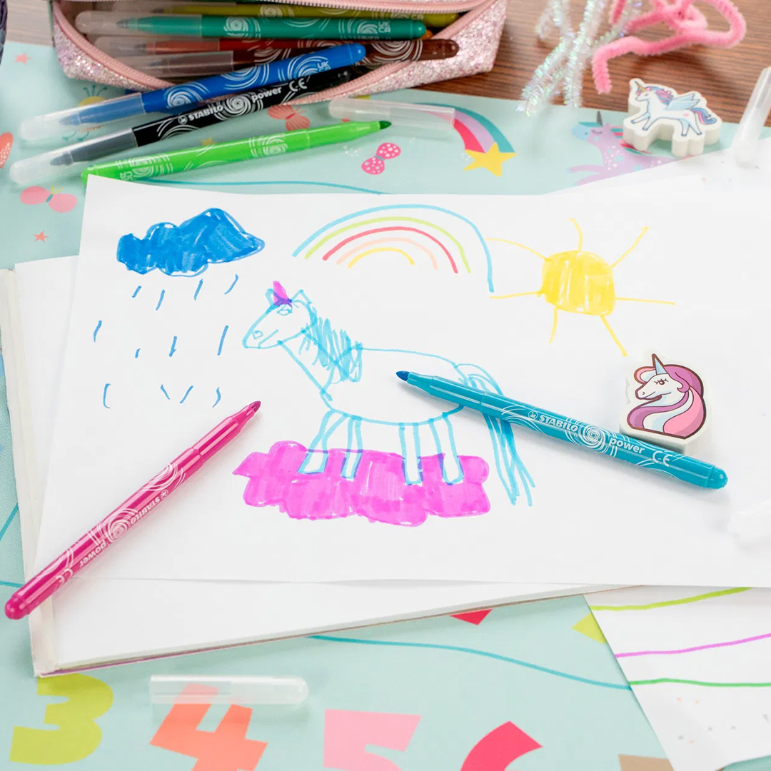 Power kestää olla ilman korkkia jopa 8 viikkoa – ennätyksellisen pitkä “cap-off”-aika. Kärki on vahva ja suunniteltu kestämään kovaa painetta, kun pieni taiteilija on vauhdissa.