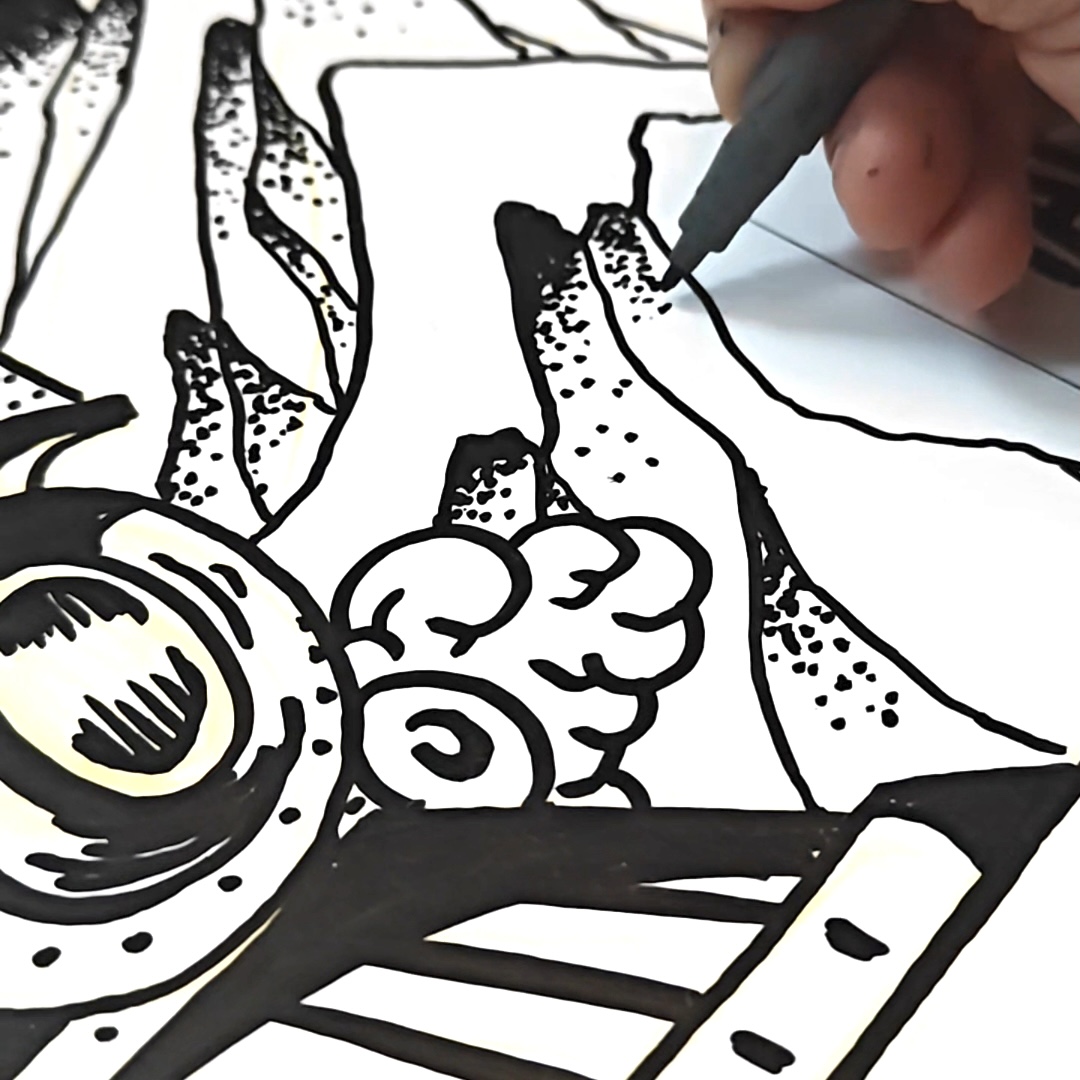 Tällainen rajoitus pakottaa ajattelemaan täysin uudella tavalla, mikä on hauskaa. On sopeuduttava siihen, mitä on käytettävissä, ja ehkä luovuttava joistakin ideoista, esimerkiksi komplementtiväreistä, siitä mitkä kynät toimivat yhdessä ja mitkä eivät juuri tällä materiaalilla. Ja pidin todella paljon piirtämisestä metrokartongille.