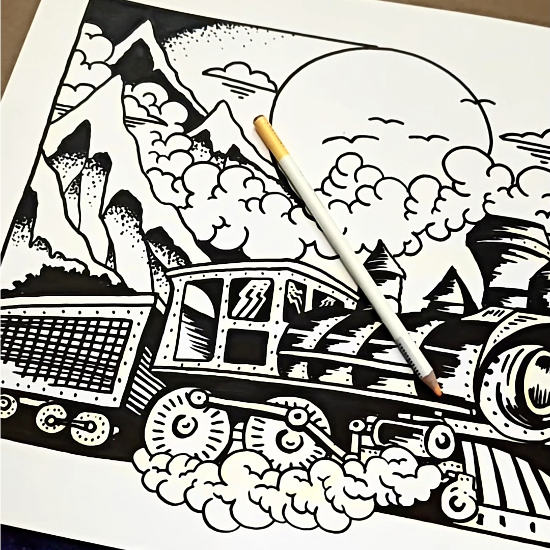 Pidän selkeästä kuvailmaisusta, joten paksut mustat linjat ja vahva kontrasti olivat ilmaisussa itsestäänselvyys. Pidän myös siitä, että teoksessa on selkeästi eroteltu etuala (juna), keskitaso (vuoret) ja tausta (taivas), sekä siitä, että juna katoaa kuvasta.