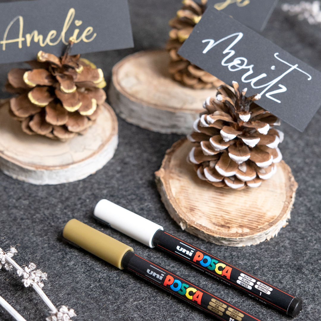Anna paikkakorteillesi graafinen ilme akryylitusseilla! Päästä luovuutesi valloilleen ja yhdistele eri kynätyyppejä, joita sinulta jo löytyy kotoa. Sekoita finelinereita, akryylitusseja ja geelikyniä. Kynien etuna on se, että ne ovat helppokäyttöisiä ja kuivuvat nopeasti, täydellisiä sekä nopeisiin ideoihin että yksityiskohtaisempiin kuvioihin. Määrittelet itse oman kunnianhimon tasosi, mutta parasta on, että saat aikaan tyylikkäät paikkakortit vain muutamassa minuutissa!