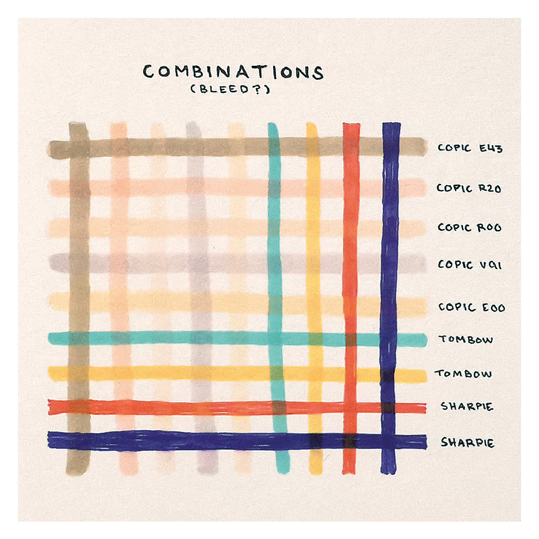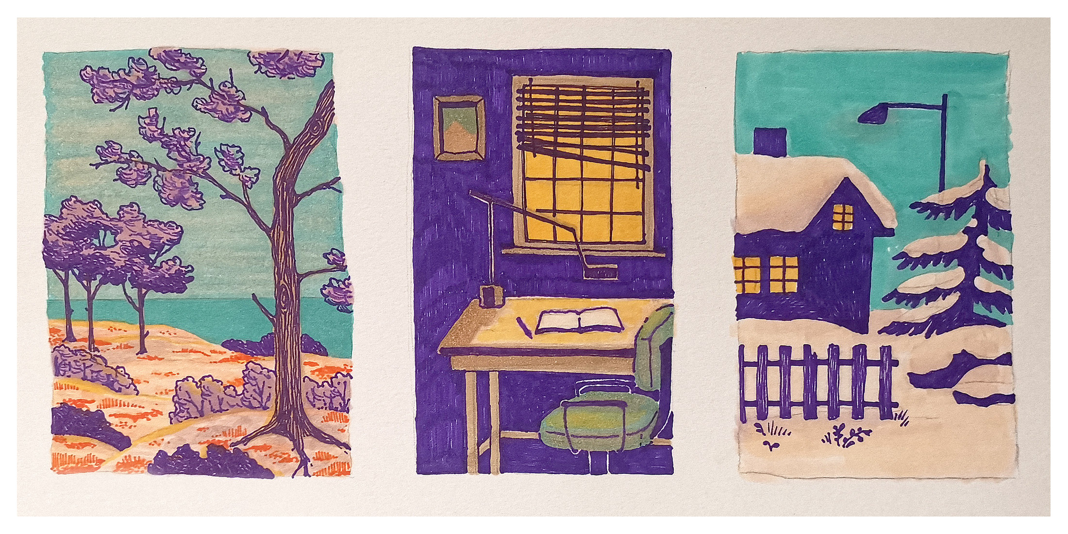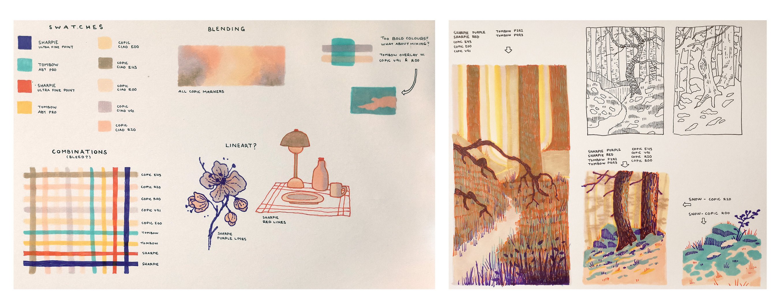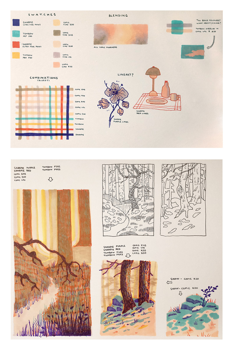 Kun olen tutustunut kyniin ja niiden väreihin, jatkan piirtämällä pieniä luonnoksia ja miniatyyrikuvia kokeillakseni erilaisia väriyhdistelmiä osana suurempaa kokonaisuutta.