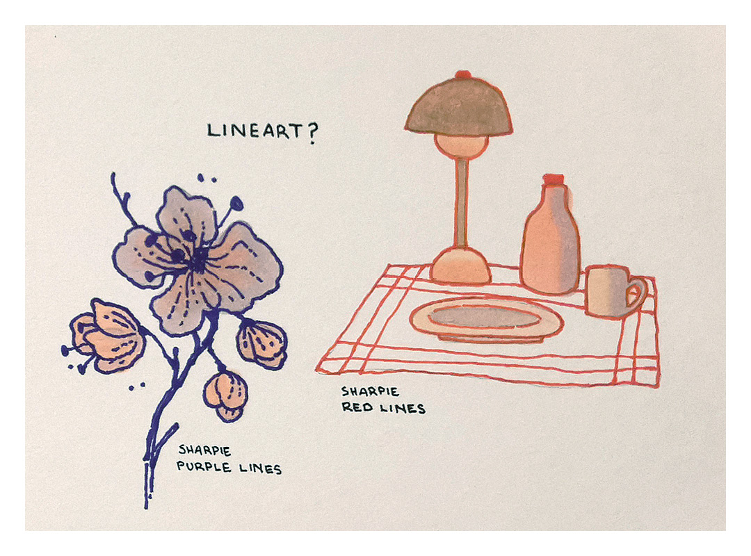 Jos käytät tussia tai värikynää, voit myös kokeilla värien sekoittamista ja luoda pehmeitä siirtymiä eri sävyjen välille. Värikynillä voi lisäksi tehdä mielenkiintoisia tekstuureja tussin ja vesivärin päälle.