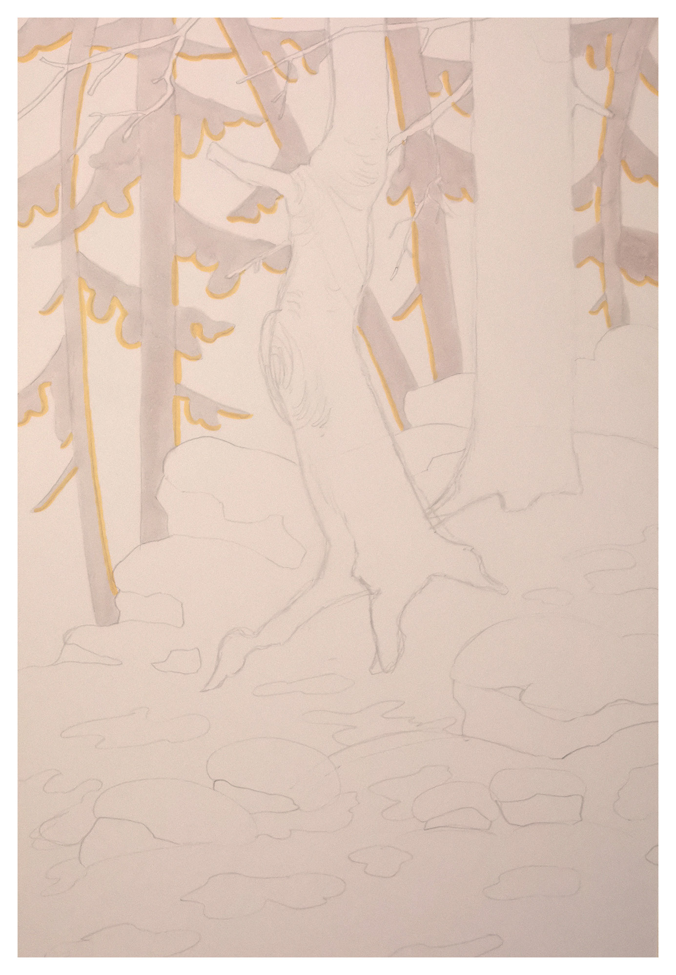 Aloitin luomalla pohjan puille ja lumelle vaaleilla roosan ja beigen sävyillä. Käytin myös keltaista antaakseni puille aavistuksen auringonvalosta.