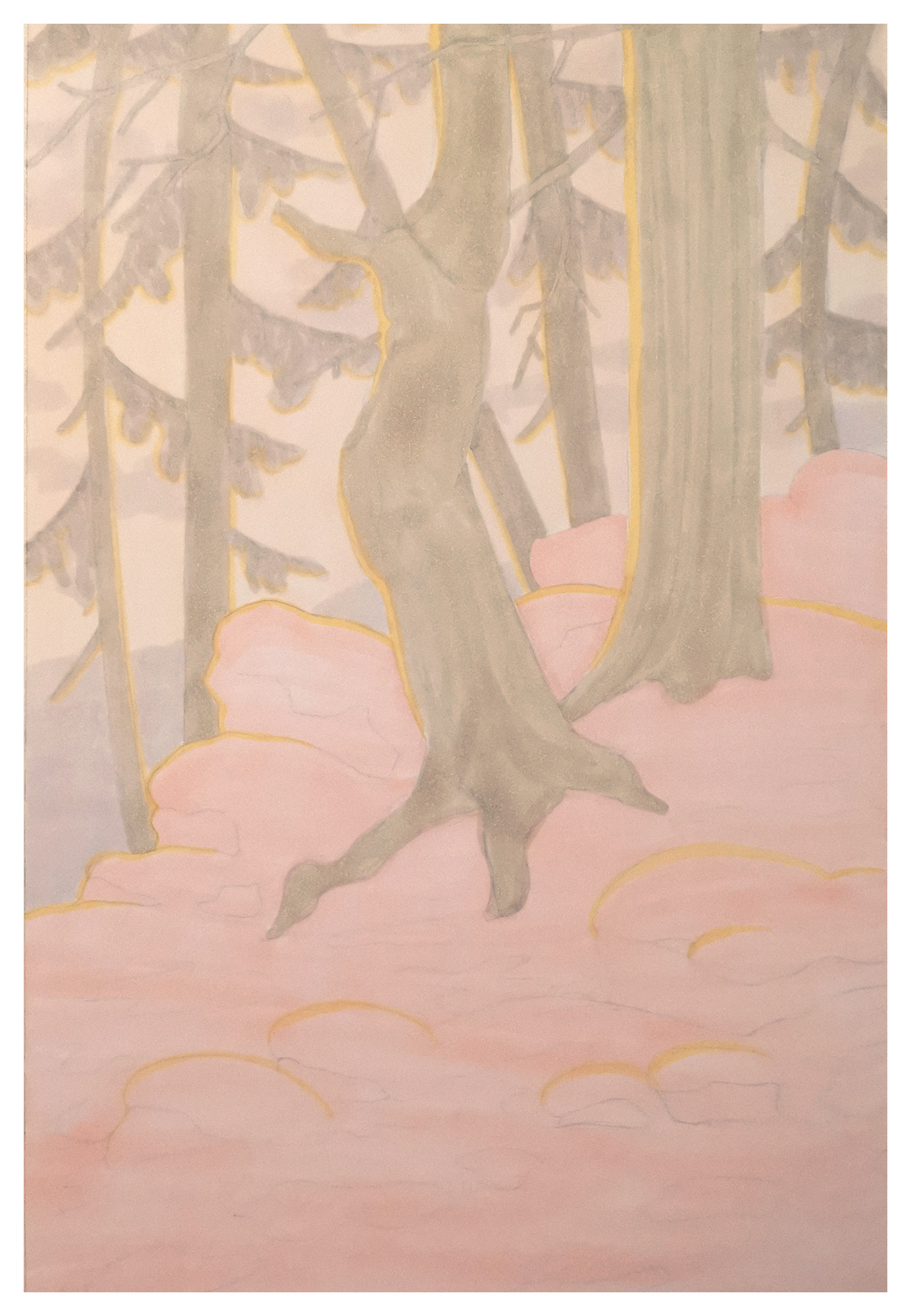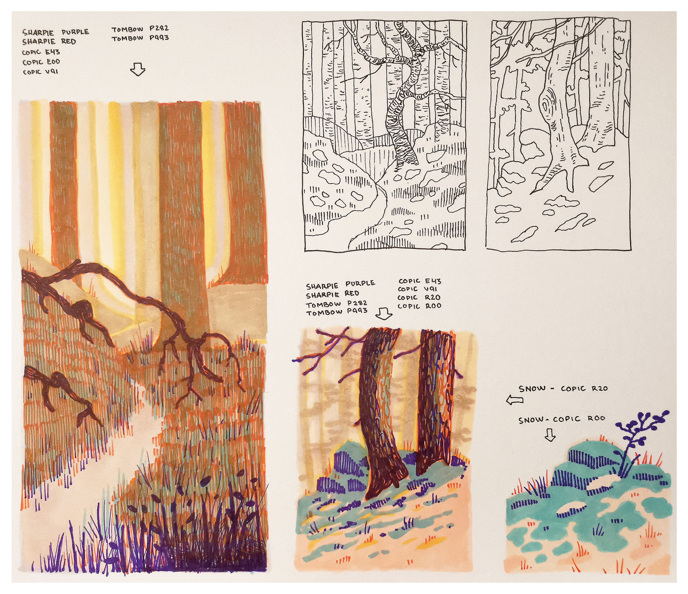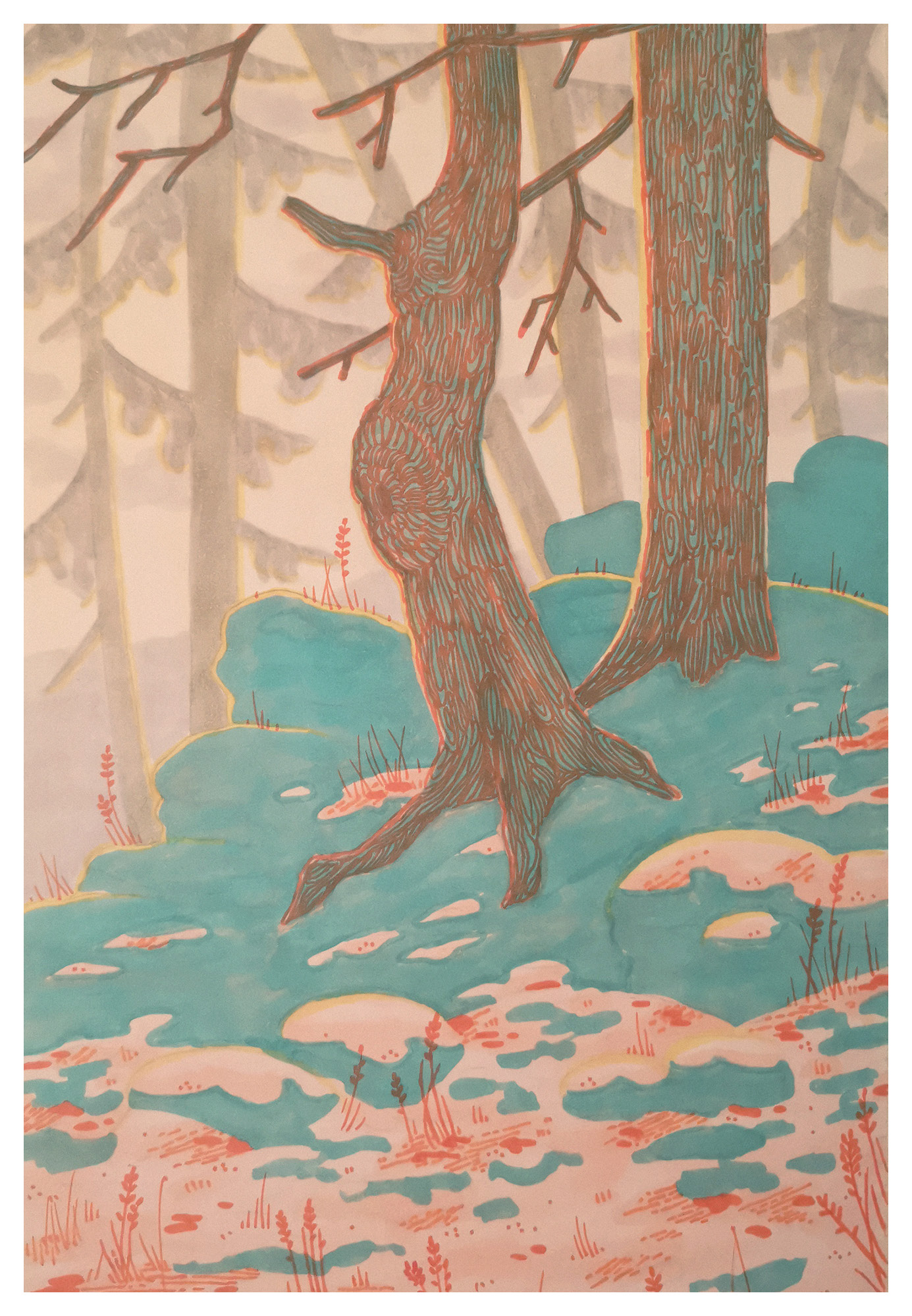 Useiden kokeilujen jälkeen päätin piirtää metsämaiseman, jossa Copic-kynien eri vaaleanpunaisen ja beigen sävyt luovat pehmeän ja lämpimän taustan. Pääaiheena on kaksi puuta talvisessa, lumen peittämässä rinteessä, josta kivet, kanerva ja ruoho pilkistävät esiin. Lumen varjot on kuvattu turkoosilla, vastakohtana muuten roosan sävyiselle lumelle, joka voi muistuttaa talvista auringonlaskua. Sekä punaista että violettia käytetään yksityiskohtien lisäämiseen ja varjojen syventämiseen. Keltaista käytetään säästeliäästi kuvaamaan auringon hohdetta.