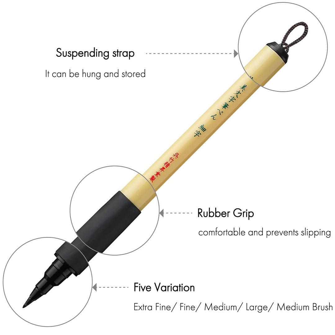 Setti sisältää viisi japanilaishenkistä sivellinkynää, jotka sopivat erinomaisesti kalligrafiaan, letteringiin, kuvitukseen, piirtämiseen ja luonnosteluun. Hienovaraisista yksityiskohdista pehmeisiin sivellinvedoin, eri kärjet tarjoavat rajattomat luovat mahdollisuudet. Mukana on myös valmiiksi painettu harjoituspaperi, jossa voi kokeilla kynien erilaisia tehosteita.