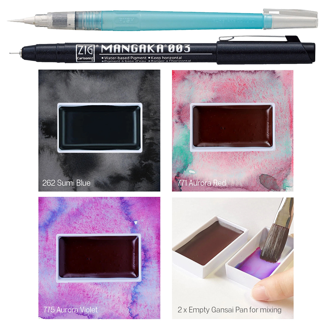 - 2 Gansai Tambi Granuloituvaa väriä: Aurora Red (771) / Aurora Violet (775)